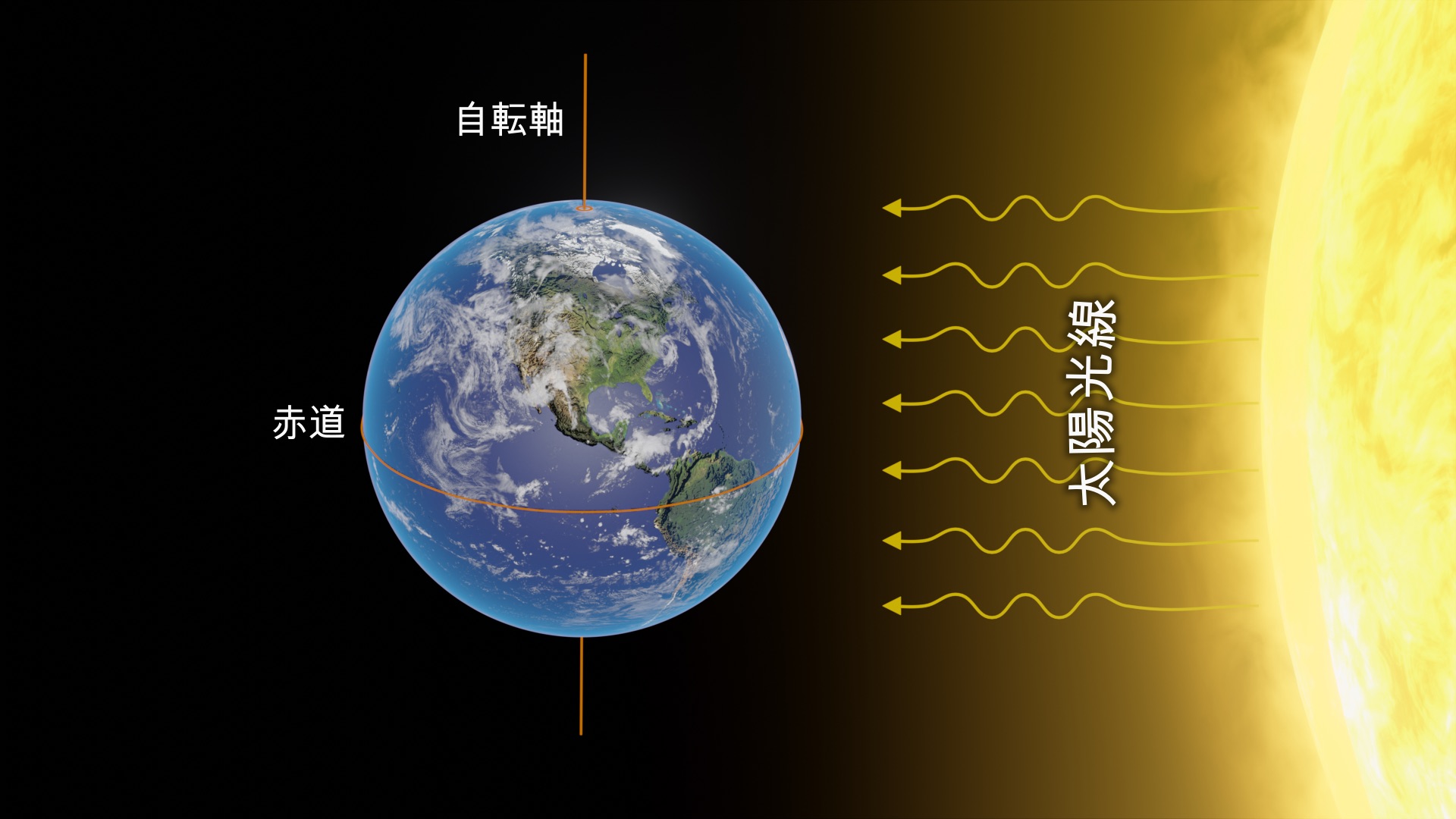 地球の自転軸は23.4度傾いていますから、北半球と南半球が年のほとんどの時間に等しくない太陽光の量を受け取ります。地球の自転軸傾斜角が季節がある理由です。