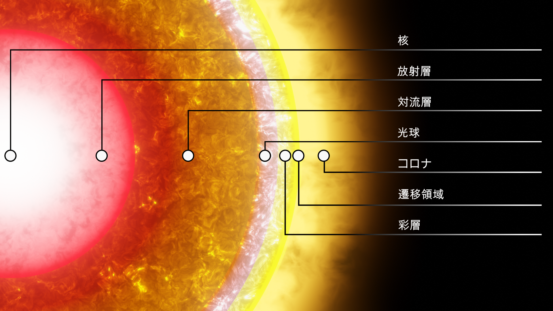- 遷移領域:上部彩層の2万Kからコロナの200万K以上へと温度が急激に上昇する、厚さ約100kmの非常に薄い層です。
