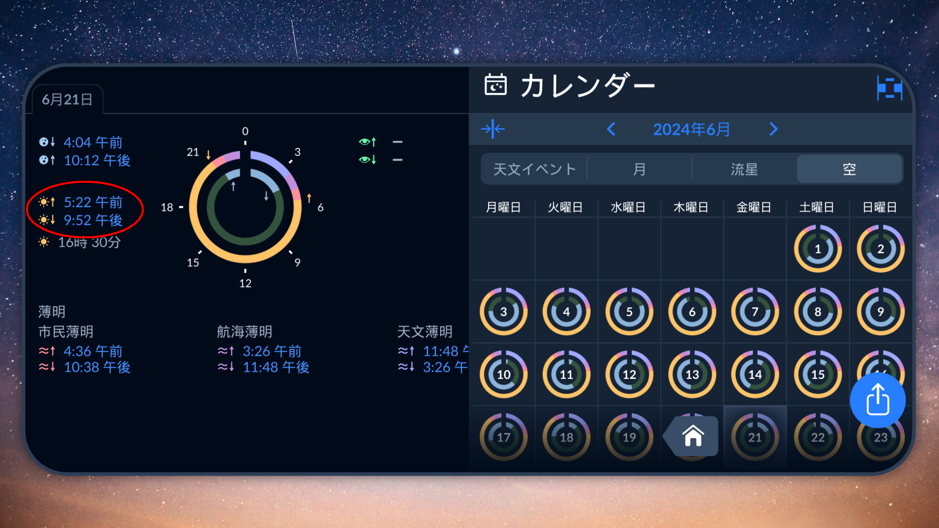 あなたの街の日の出と日の入りの時間を知りたい、または市民薄明、天文薄明、航海薄明の時間など、より具体的な情報をアクセスしたい場合は、Sky Tonightアプリのカレンダーをチェックしてください。空のタブを開き、お好みの表示形式(ラインまたはサークル)を選択します。青でハイライトされた時間はインタラクティブです。その時間に空がどのように見えるかを確認するためにそれらをクリックしてください。