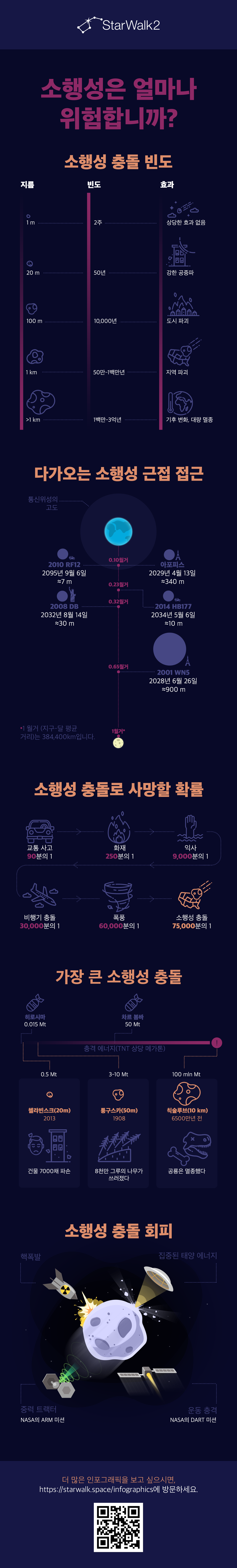 많은 사람들이 소행성이 지구에 충돌하면 어떤 일이 일어날지 궁금해합니다. 글쎄요, 작은 소행성은 2주마다 지구에 충돌하지만 특별한 일은 일어나지 않습니다. 하지만 만약 그것이 거대한 소행성이라면? 우리의 인포그래픽을 사용하여 소행성이 크기에 따라 지구에 영향을 미칠 수 있는 방법과 소행성 충돌을 피하기 위해 무엇을 할 수 있는지 알아보세요. 이 인포그래픽이 마음에 든다면 주저하지 말고 친구들과 공유하세요! 인스타그램 에서도 #infographics_StarWalk 해시태그를 통해 볼 수 있다. 더 많은 우주 관련 정보는 인스타그램에서 찾아보세요!