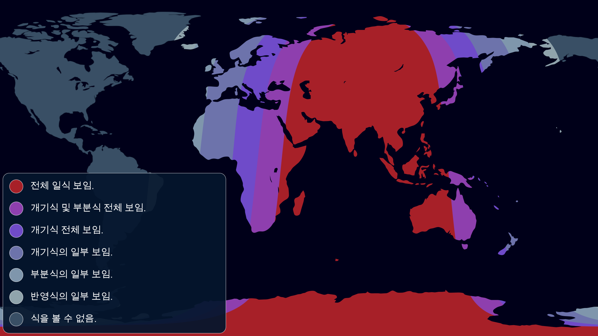 - 전체 월식은 호주, 인도, 중앙아시아, 러시아 일부 지역, 일본, 동아프리카 지역에서 볼 수 있습니다.