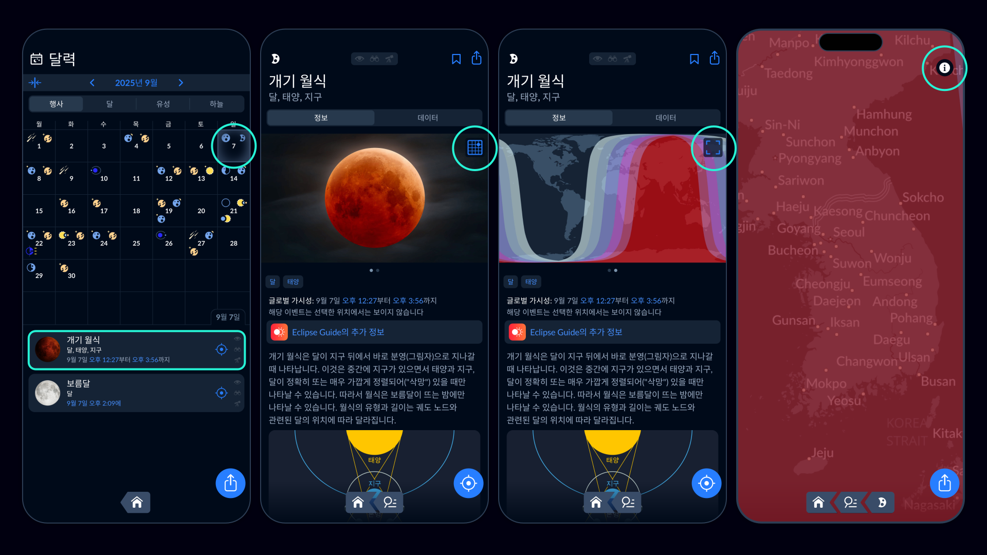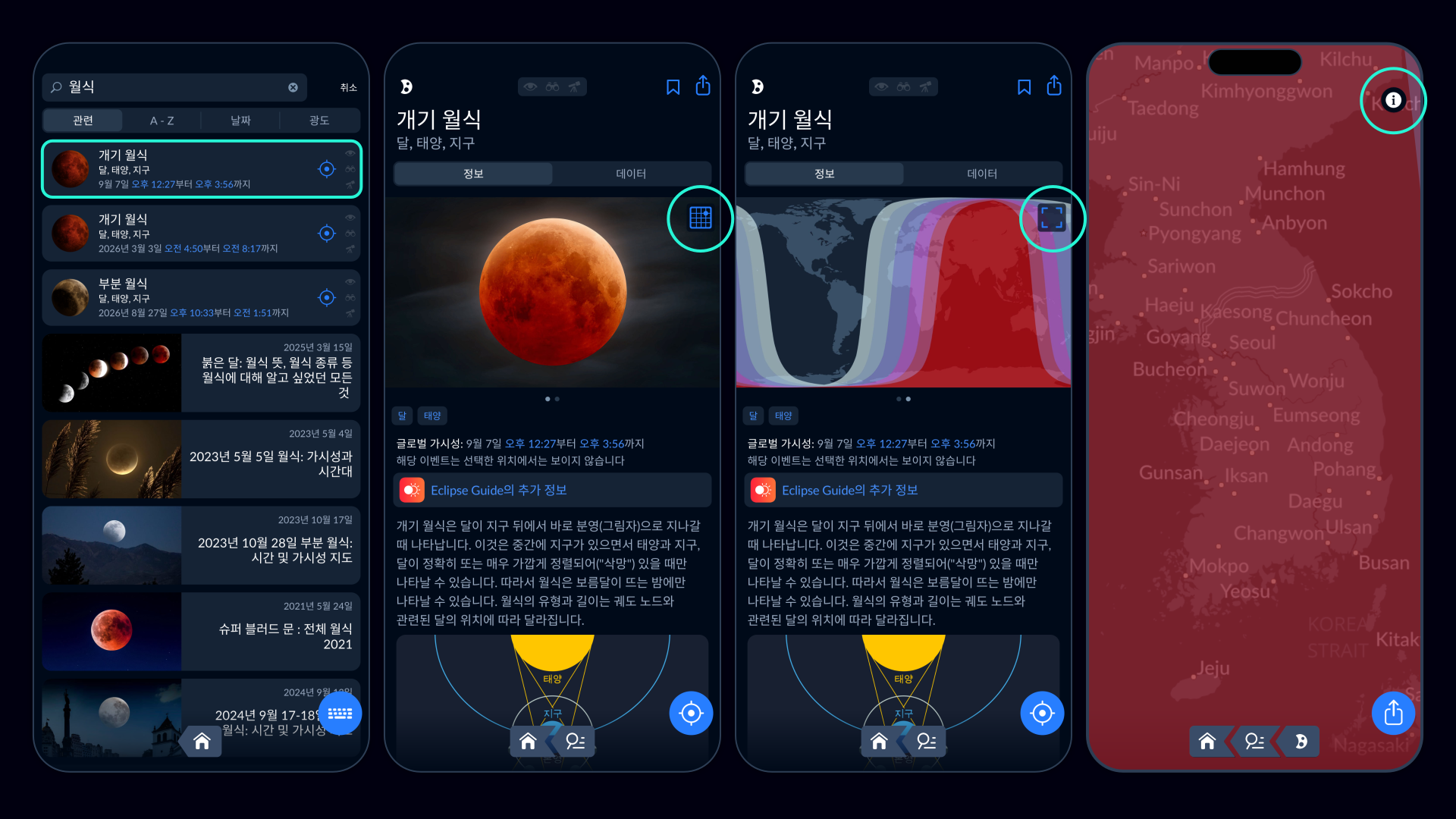 또한 이 앱은 현재 시간대의 정확한 월식 시간을 제공하고, 가장 잘 관측할 수 있는 장소를 추천하며, 월식을 놓치지 않도록 미리 알림을 제공합니다. 월식은 매년 발생하기 때문에 Eclipse Guide는 향후 관측 계획을 세우는 데에도 도움이 될 수 있습니다.
