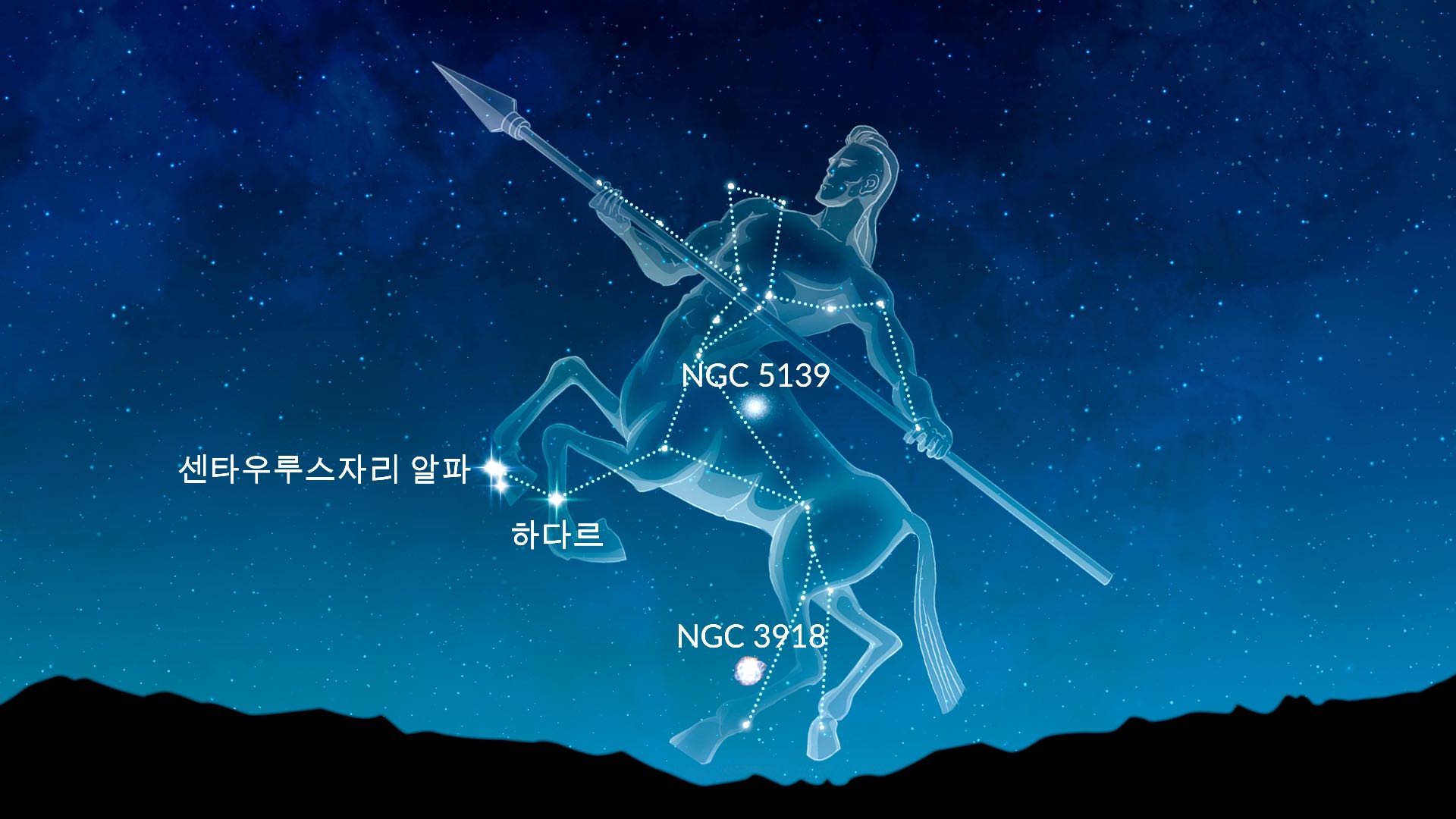 켄타우로스자리에는 우리와 가장 가까운 항성계이자 밤하늘에서 가장 밝은 별 중 하나인 알파 센타우리가 있는 곳입니다. 하다르(자리에서 두 번째로 밝은 별)와 함께 남십자자리를 가리키는 선을 형성합니다. 또한 센타우루스자리에는 오메가 센타우루스자리(NGC 5139), 푸른 행성상 성운(NGC 3918), 그리고 센타우루스자리 A, NGC 4603, NGC 4622, NGC 4945 은하가 포함되어 있습니다. 켄타우로스자리는 65°N 이하에서 관찰할 수 있으며 60°S 이하에서는 주극성입니다.