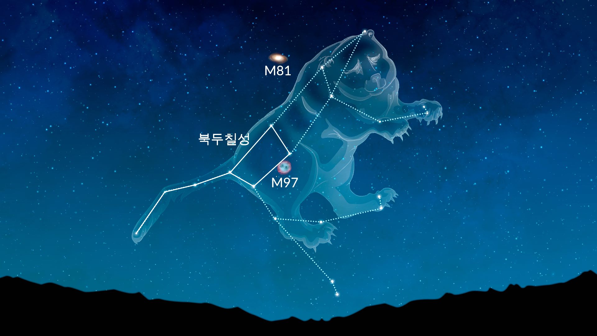 큰곰자리는 하늘에서 가장 크고 가장 잘 알려진 별자리 중 하나입니다. 밤하늘에서 가장 눈에 띄는 별 패턴 중 하나인 북두칠성 별자리로 쉽게 식별할 수 있습니다. 이 별자리에는 또한 잘 알려진 수많은 깊은 하늘 천체들이 있습니다. 쌍안경으로 보데의 은하(M81)와 시가 은하(M82)를 관측할 수 있습니다. 한편, 망원경으로 올빼미 성운(M97)과 바람개비 은하(M101)를 볼 수 있습니다. 큰곰자리는 남위 30도 이상에서 관측할 수 있으며, 북위 60도 이상에서 환극성입니다.