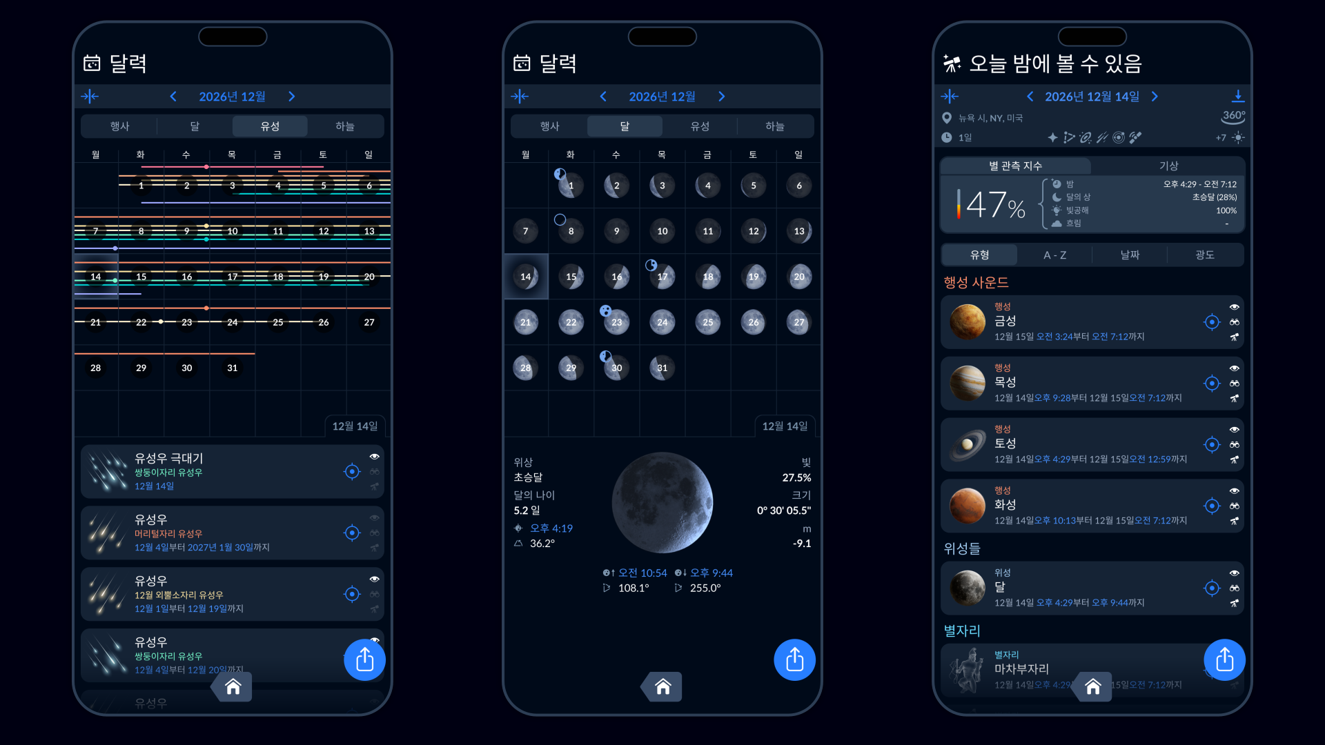 2026년 12월은 유성 관측에 아주 좋은 달입니다. 이번 달 최고의 유성은 12월 13일에서 14일 밤, 비교적 어두운 달빛 아래에서 절정을 이루는 쌍둥이자리 유성우입니다. 또한, 12월 8일과 9일에는 달빛이 없는 어두운 밤하늘 아래에서 덜 알려진 두 유성우, 즉 12월 외뿔소자리 유성우와 바다뱀자리 시그마 유성우를 관측할 좋은 기회도 있습니다. Sky Tonight 앱을 사용하여 특정 날짜의 달 위치와 복사 위치를 확인하세요. 또한 성공적인 유성 사냥을 준비하려면 인포그래픽을 살펴보세요. 맑은 하늘과 행복한 관찰을 기원합니다!