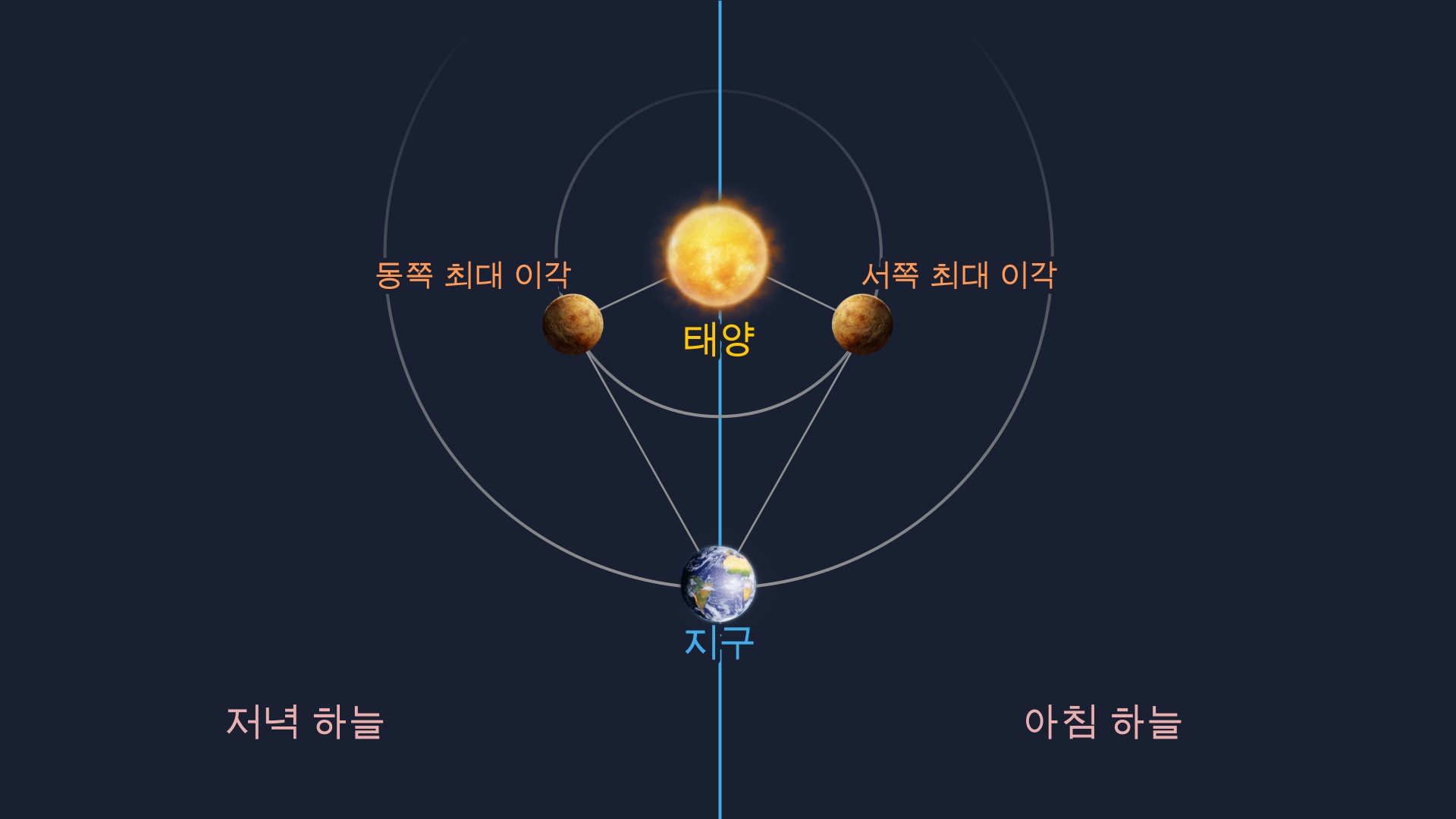 금성의 최대이각은 대략 9개월마다 일어납니다. 이 기간 동안 금성은 새벽 하늘에서 밝게 빛나기 때문에 "샛별"이라는 이름이 붙었으며, 서방최대이각은 아침 이각이라고도 불립니다. 금성이 해질 무렵에 하늘에 나타나기 때문에 동방최대이각은 저녁 이각이라고도 합니다.