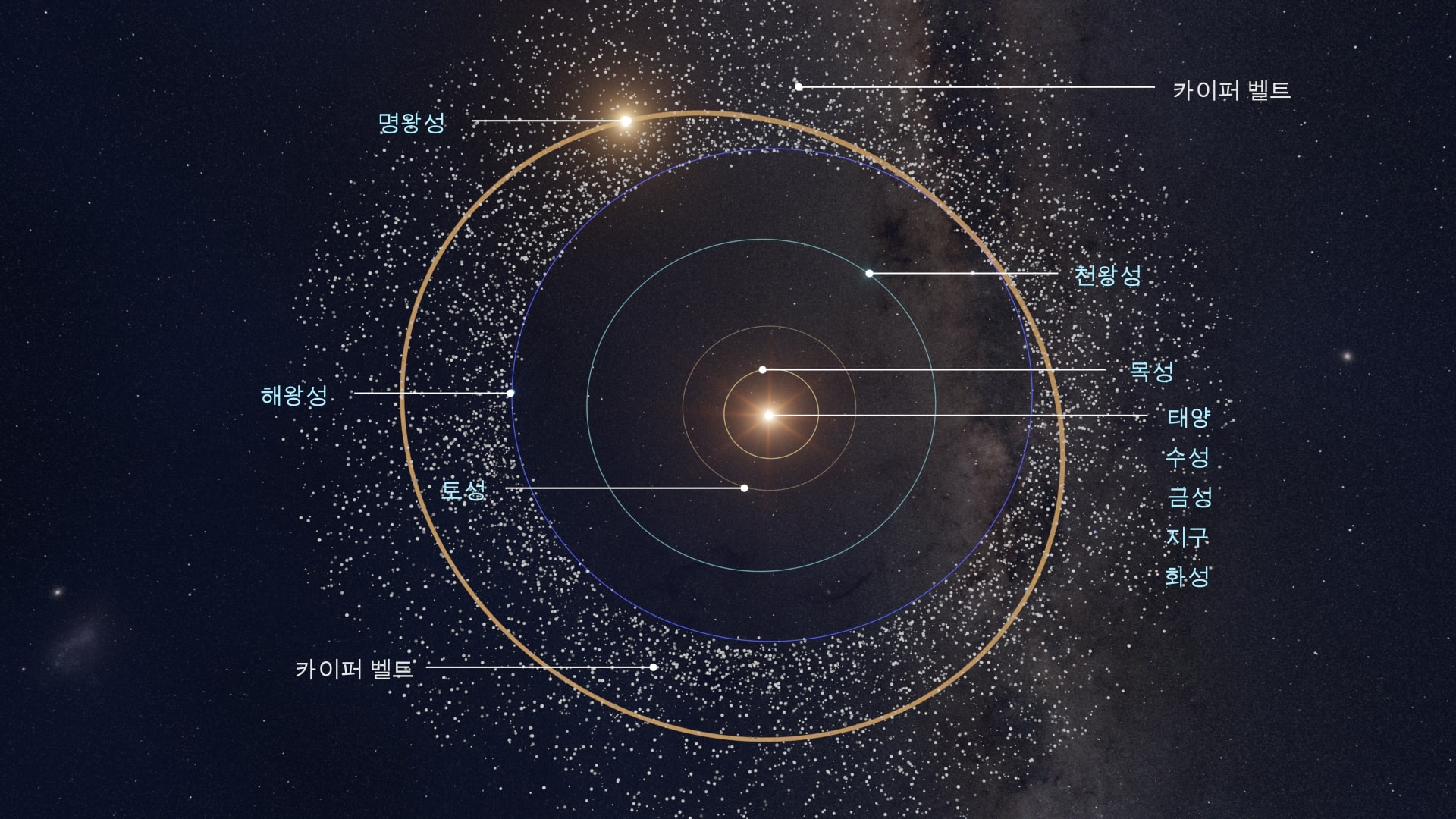 명왕성은 수천 개의 작은 얼음 물체로 채워진 해왕성의 궤도 너머에 있는 도넛 모양의 지역인 카이퍼 벨트의 구성원입니다. 이 천체(카이퍼 벨트 천체, 해왕성 횡단 천체 또는 명왕성으로 알려짐)는 약 45억 년 전에 태양계가 형성되었을 때의 잔해입니다.