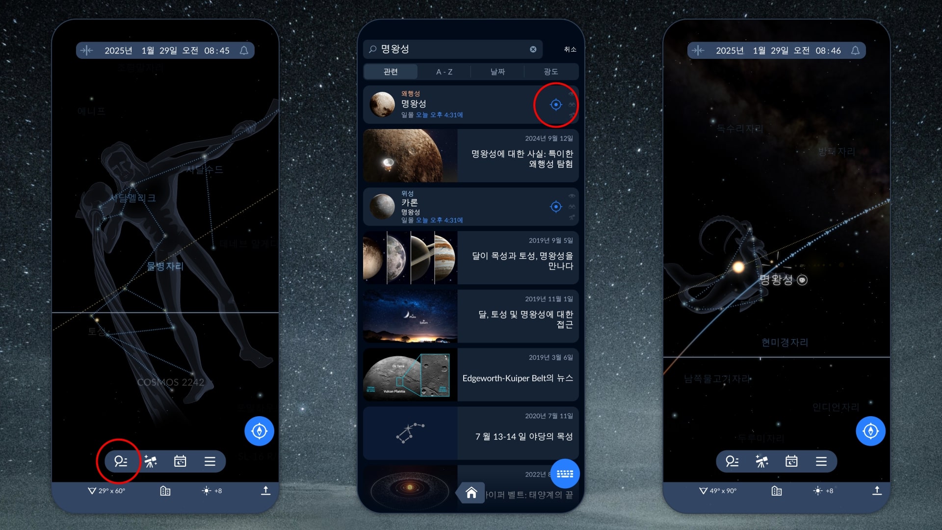 명왕성은 관측하기 쉽지 않습니다. 망원경으로 보더라도 배경 별들과 구분하기 어려운 매우 희미한 점처럼 보입니다. 하지만 천문 앱 Sky Tonight을 사용하면 밤하늘을 탐색하고 명왕성처럼 찾기 어려운 천체를 쉽게 찾을 수 있습니다. 메인 화면 하단에 있는 돋보기 아이콘을 탭하고 검색창에 왜소행성의 이름을 입력한 다음 해당 결과 옆에 있는 파란색 조준 아이콘을 탭하세요. 팁 하나 더: 명왕성은 충일 때 가장 밝게 빛나고 밤하늘에 가장 오래 머물기 때문에 이때 관측하는 것이 가장 좋습니다.