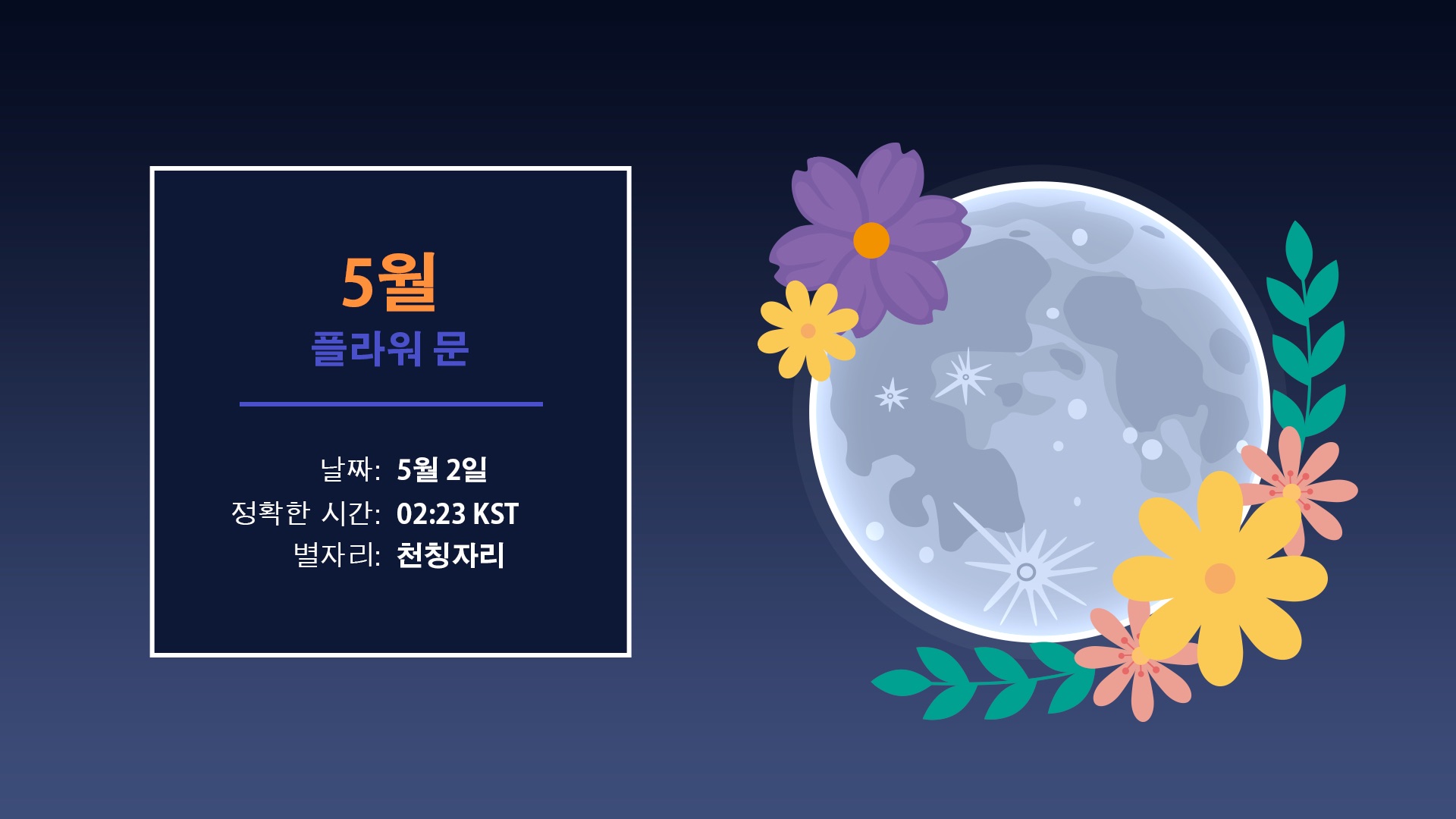 다음 보름달은 전통적으로 꽃달 이라고 불리며, 2026년 5월 1일 17:23 UTC/GMT(한국 표준시 2026년 5월 2일 02:23, KST)에 뜹니다. 이 보름달은 천칭자리에서 관측되며, 마이크로문 이자 2026년 5월에 뜨는 두 번의 보름달 가운데 첫 번째 보름달이기도 합니다.
