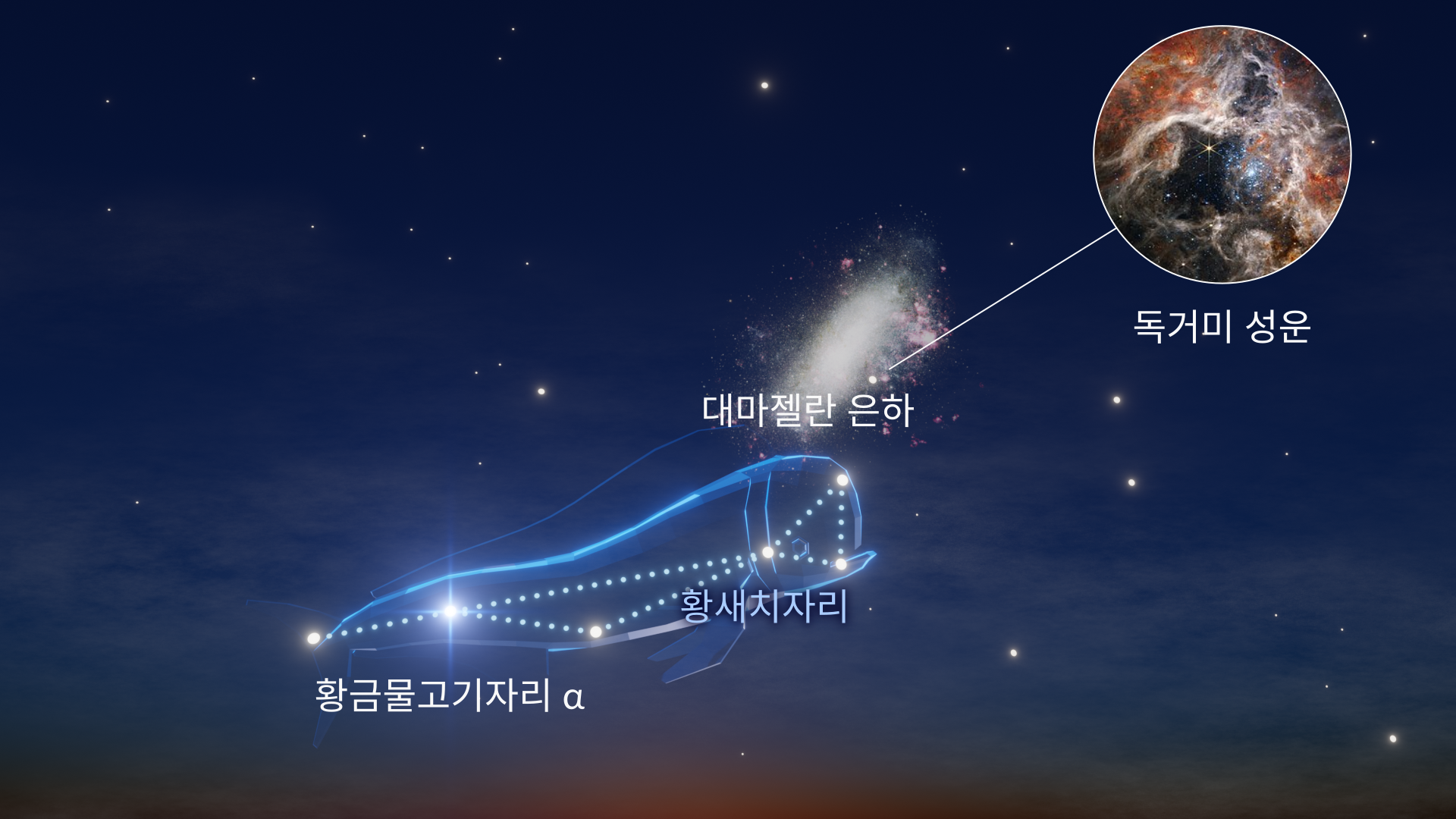 황새치자리는 남반구에 있는 희미한 별자리입니다. 가장 밝은 별인 황새치자리 알파(3.3등급)는 어둡고 공해가 적은 하늘에서만 맨눈으로 가장 잘 볼 수 있습니다. 황새치자리에는 이 지역에서 가장 눈에 띄는 천체인 대마젤란운(LMC)이 많이 포함되어 있습니다. 대마젤란운은 맨눈으로도 볼 수 있지만, 쌍안경이나 망원경을 사용하면 타란툴라 성운(30 도라두스)을 비롯한 더 많은 성단과 성운을 관측할 수 있습니다.