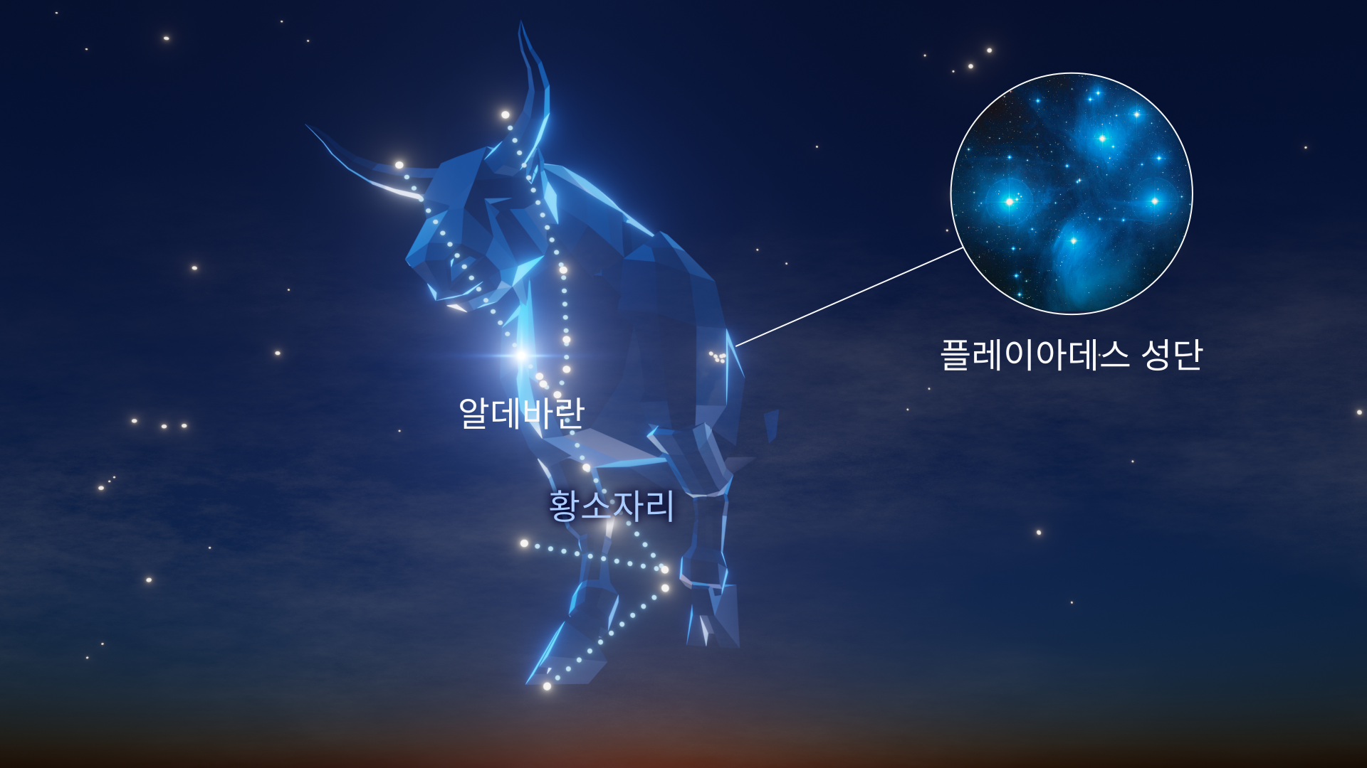 조디악 별자리 황소자리는 마차부자리의 서쪽에 위치하고 있으며 불타는 붉은 별 알데바란과 아름다운 플레이아데스 성단으로 유명합니다. 신화에서 이 황소는 곤봉과 방패로 자신을 방어하는 오리온에게 돌진합니다. 플레이아데스에는 300개가 넘는 별이 있으며, 육안으로 6~7개를 볼 수 있는 경우가 많습니다.