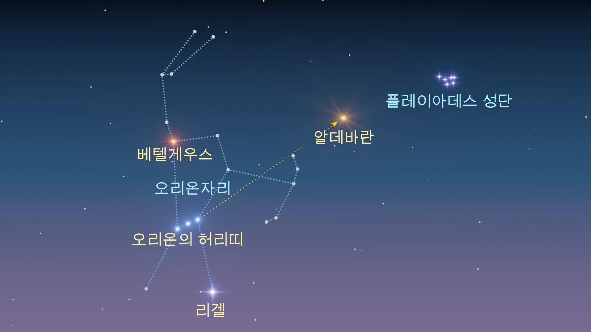 이 별들을 지나 오리온의 활을 향해 가상의 선을 그으세요.