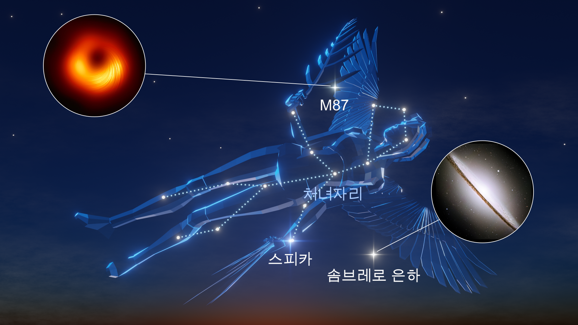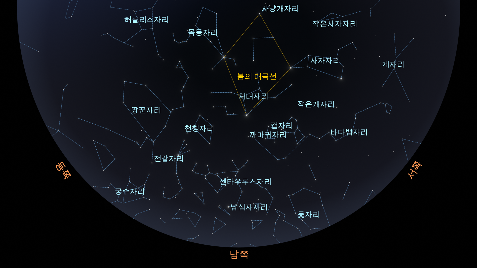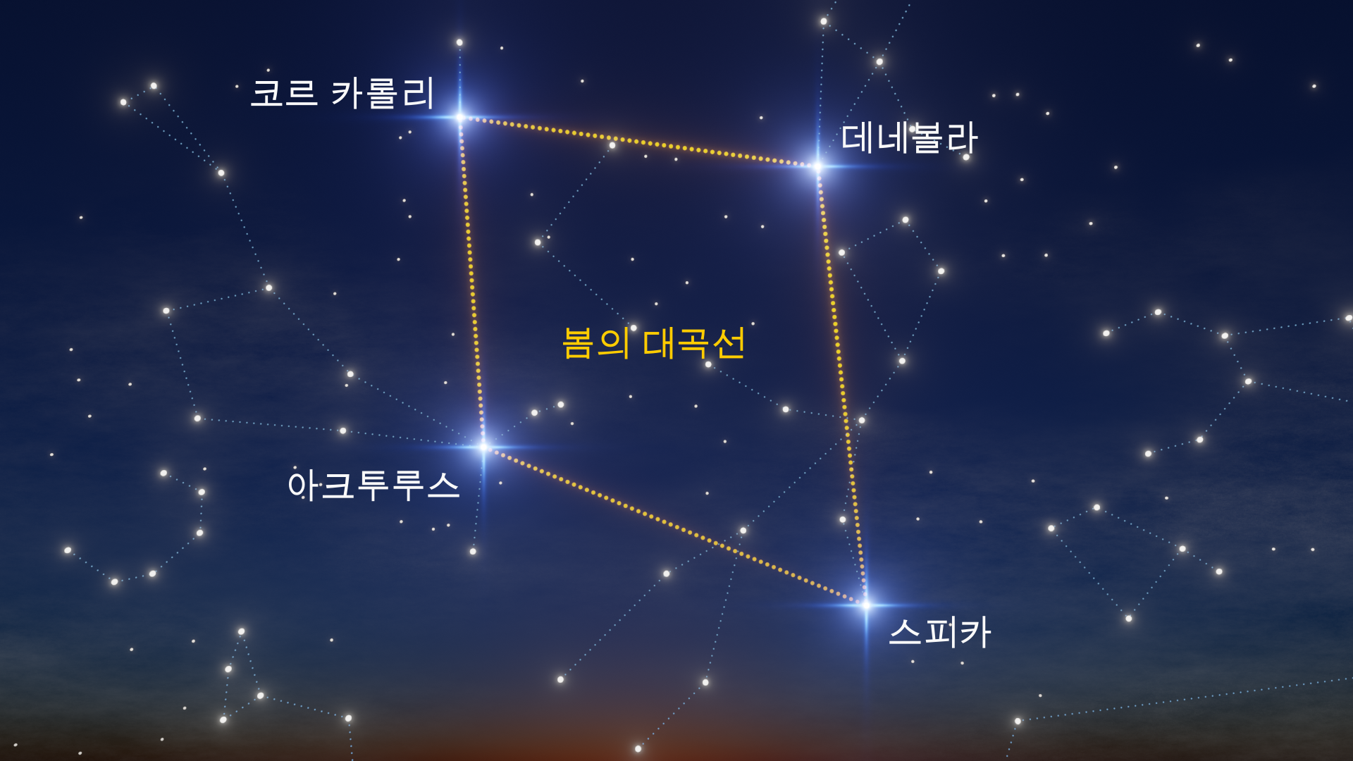 - 봄: 사자자리 - 처녀자리 - 큰곰자리