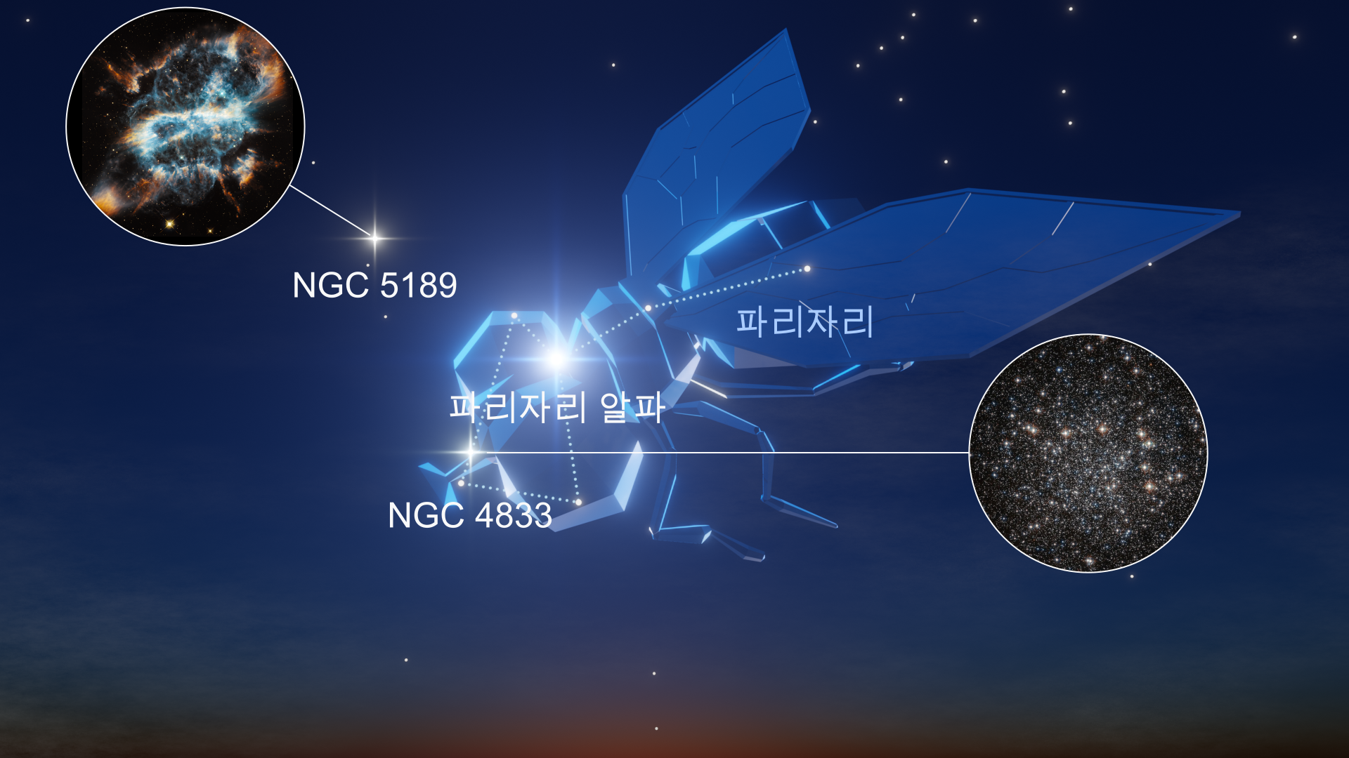 - 최고의 심원천체: NGC 4833 🔭(7.8등급), 나선 행성상 성운 🔭(8.2등급)
