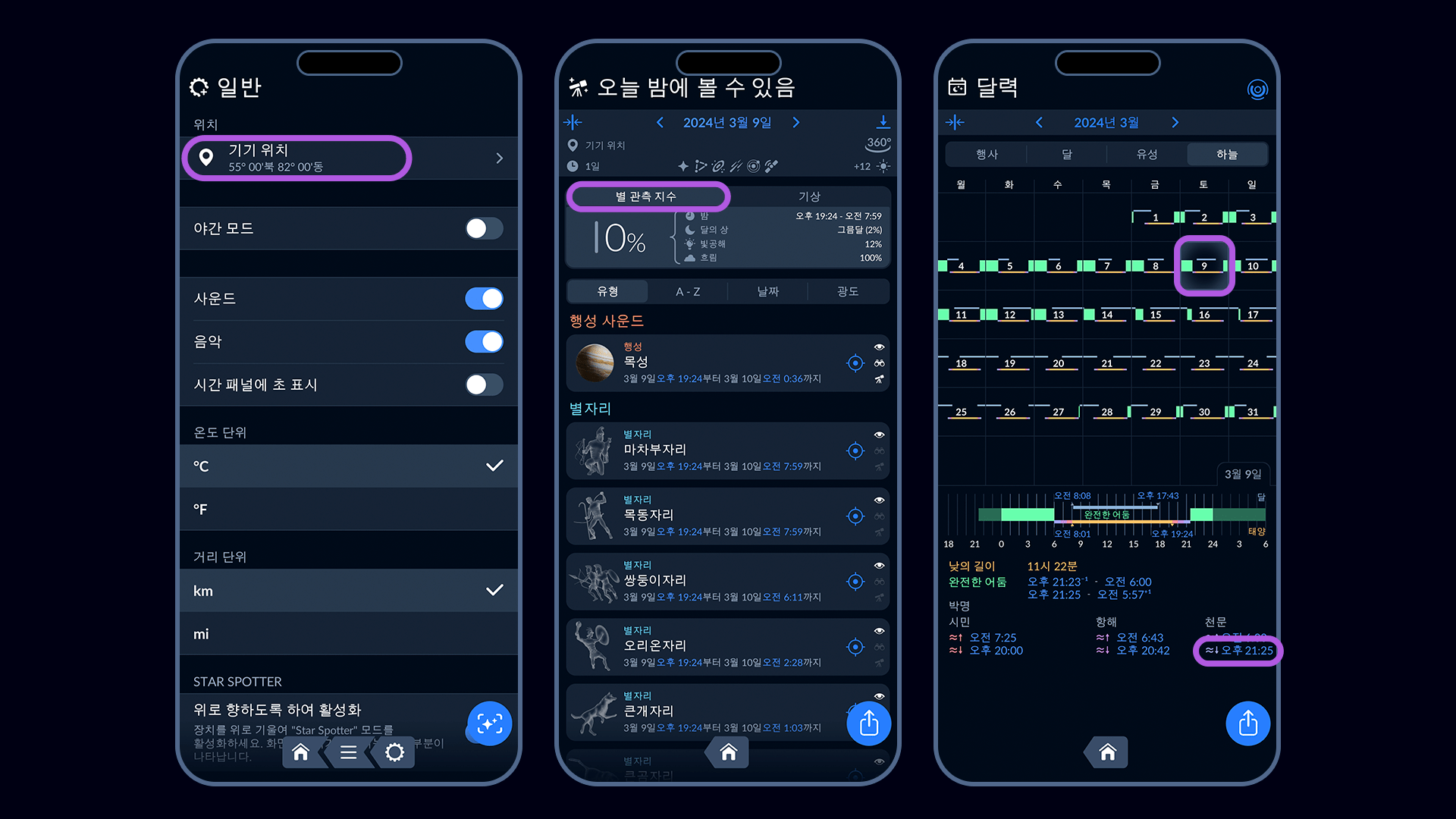 - 최적 관측 지역: 남위 20°~북위 55°