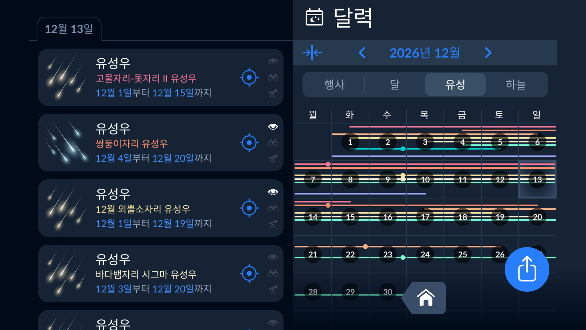 지금까지 2026년 가장 주목할 만한 유성우 목록을 살펴보았습니다. 올해의 모든 유성우와 그 절정기에 대한 정보를 원하시면 Sky Tonight 앱의 캘린더를 참조하세요. 화면 하단의 달력 아이콘을 탭하고 '유성' 탭을 열면 됩니다.