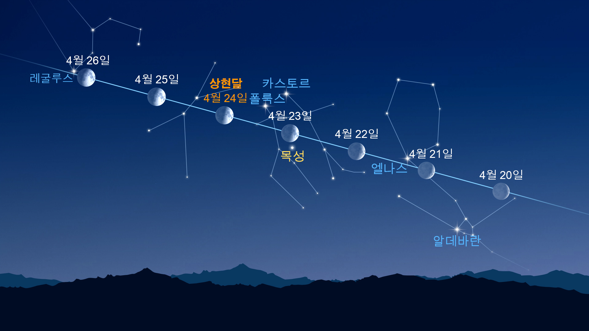 달은 4월 24일 상현에 이르며, 주가 지날수록 밤하늘에서 더욱 두드러지게 보일 것입니다. 다음 주인 2026년 5월 1일 17:23 UTC/GMT (5월 2일 02:23 KST)에 달은 보름달이 됩니다.