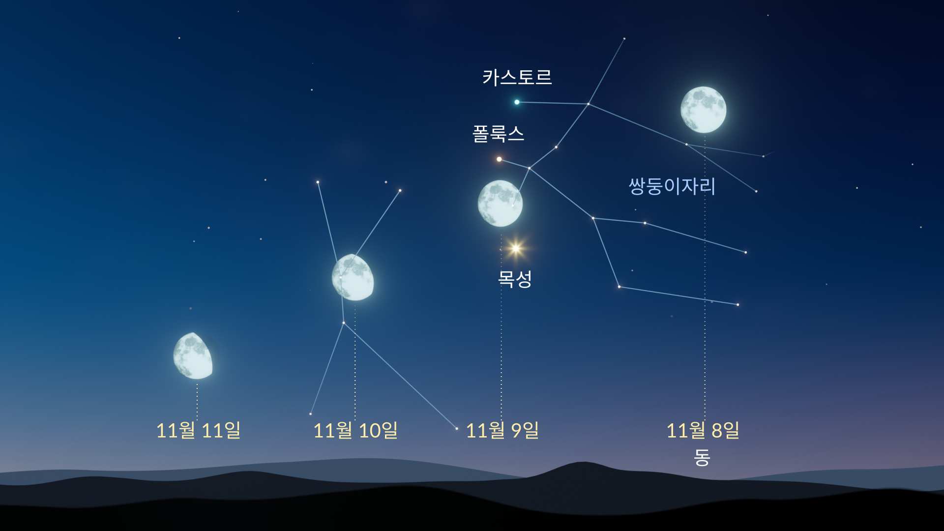 달은 11월 8일부터 11일까지 여러 날 밤 목성, 폴룩스, 카스토르가 이루는 선 근처를 지나가며, 11월 9일~10일 밤에 가장 잘 보입니다. 이때 달이 이 세 행성에 가장 가까이 접근하여 일부 지역에서는 거의 일직선으로 정렬됩니다.
