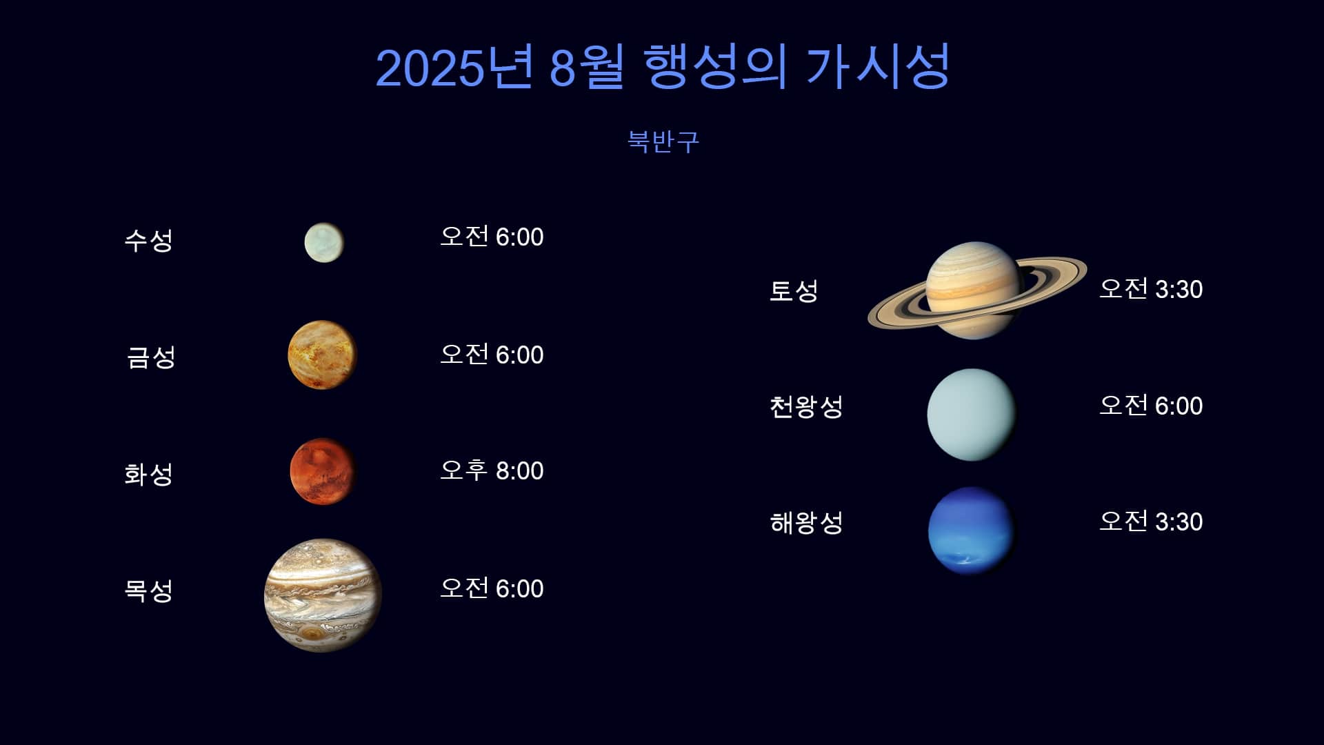 8월 최고의 천문 현상 세 가지는 8월 10일의 6행성 퍼레이드, 8월 11일-12일의 페르세우스 유성우 정점, 그리고 8월 12일의 금성-목성 합입니다. 2025년의 모든 주요 천문 현상에 대해 알아보려면 다채로운 인포그래픽을 방문하세요.