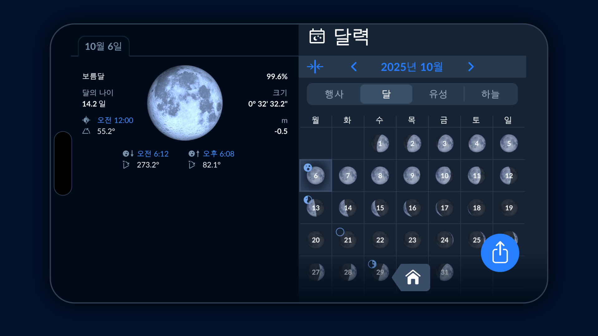 Sky Tonight 천문 앱의 달 달력에서 달의 위상, 밝기, 위치 및 기타 세부 정보를 확인할 수 있습니다. 앱을 열고 메인 화면 하단의 달력 아이콘을 탭한 후 "달" 탭으로 이동하면 달에 대한 최신 정보를 모두 확인할 수 있습니다. 달력에 표시된 달의 이미지는 그날의 실제 달의 모습을 보여줍니다.