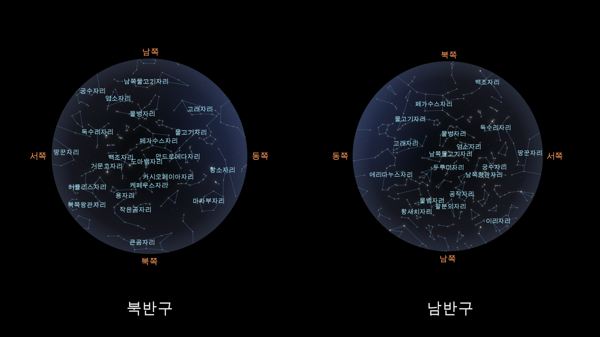 남반구에서는 황도대 별자리인 물고기자리, 물병자리, 염소자리, 궁수자리가 저녁 하늘을 장악하고 있으며, 거대한 바다 동물인 고래자리도 함께 보입니다. 남쪽에 사는 관찰자들은 북쪽에서는 볼 수 없는 우아한 그루스, 남극 근처의 희미한 팔각형별, 밝은 별 포말하우트로 표시된 물고기자리 아우스트리누스와 같은 별자리도 볼 수 있습니다.