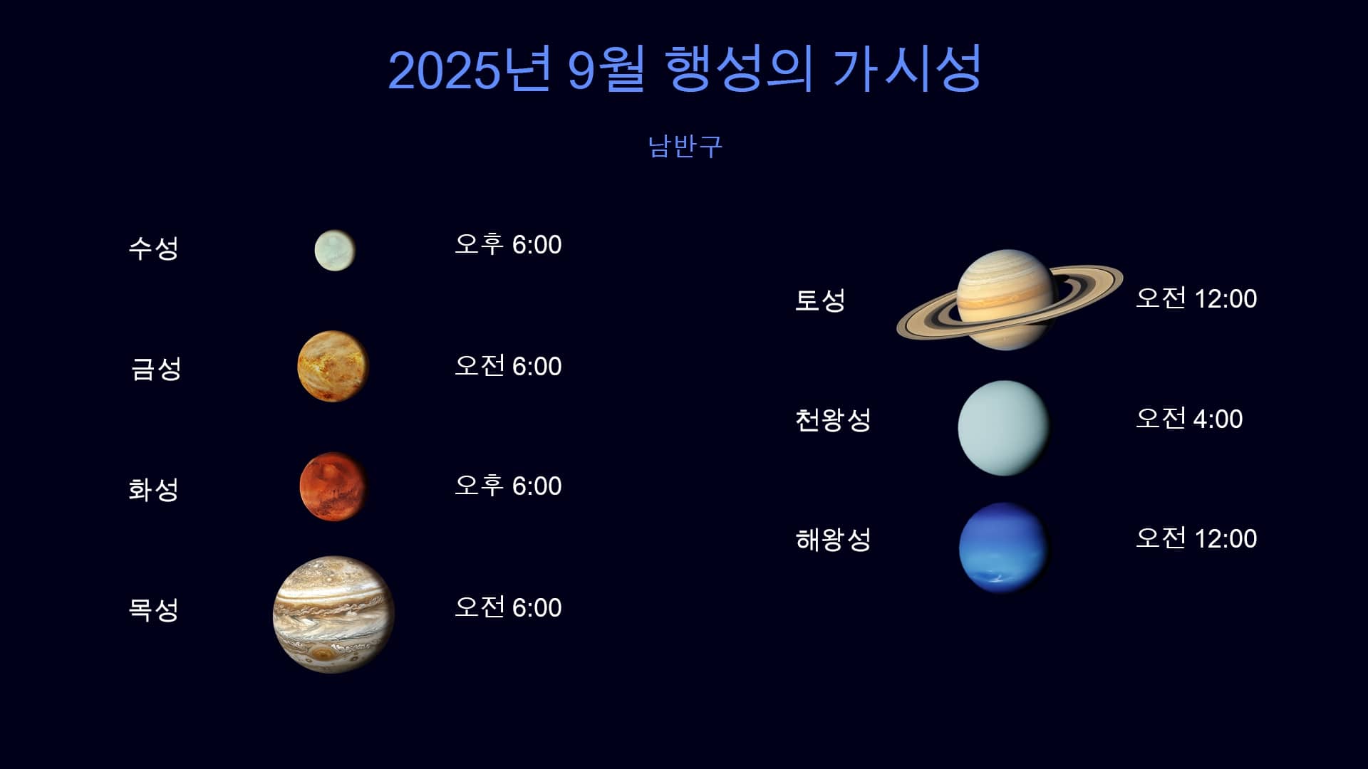 2025년 9월 남반구에서 관측 가능한 행성
