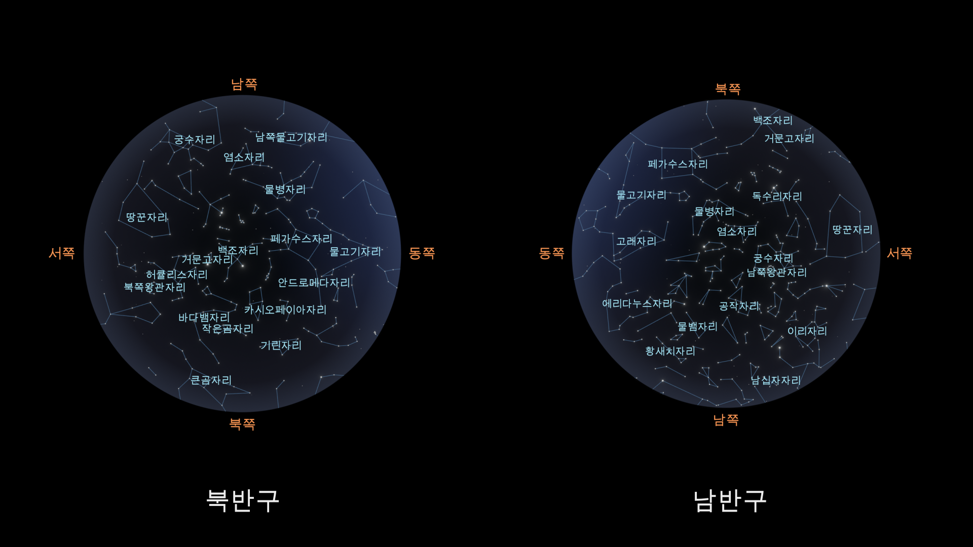 9월에는 남반구와 북반구 모두에서 주목할 만한 별자리들이 다양하게 나타납니다. 황도대를 따라 황도 12궁의 별자리들을 찾아보세요. 물고기자리, 물병자리, 염소자리, 궁수자리는 남반구에서 잘 보이며, 전갈자리는 남반구에서 가장 눈에 띄는 별자리입니다. "13번째 별자리"인 뱀주인자리 또한 지구 양쪽에서 쉽게 찾을 수 있습니다. 황도대 너머로는 여름의 대삼각형(독수리자리, 백조자리, 거문고자리)과 밤하늘을 수놓는 페가수스자리, 안드로메다자리를 볼 수 있습니다. 또한 북반구 남쪽 하늘에서 낮게 빛나는 밝은 별 포말하우트가 특징인 남반구 별자리인 물고기자리 남쪽 별자리도 볼 수 있습니다.