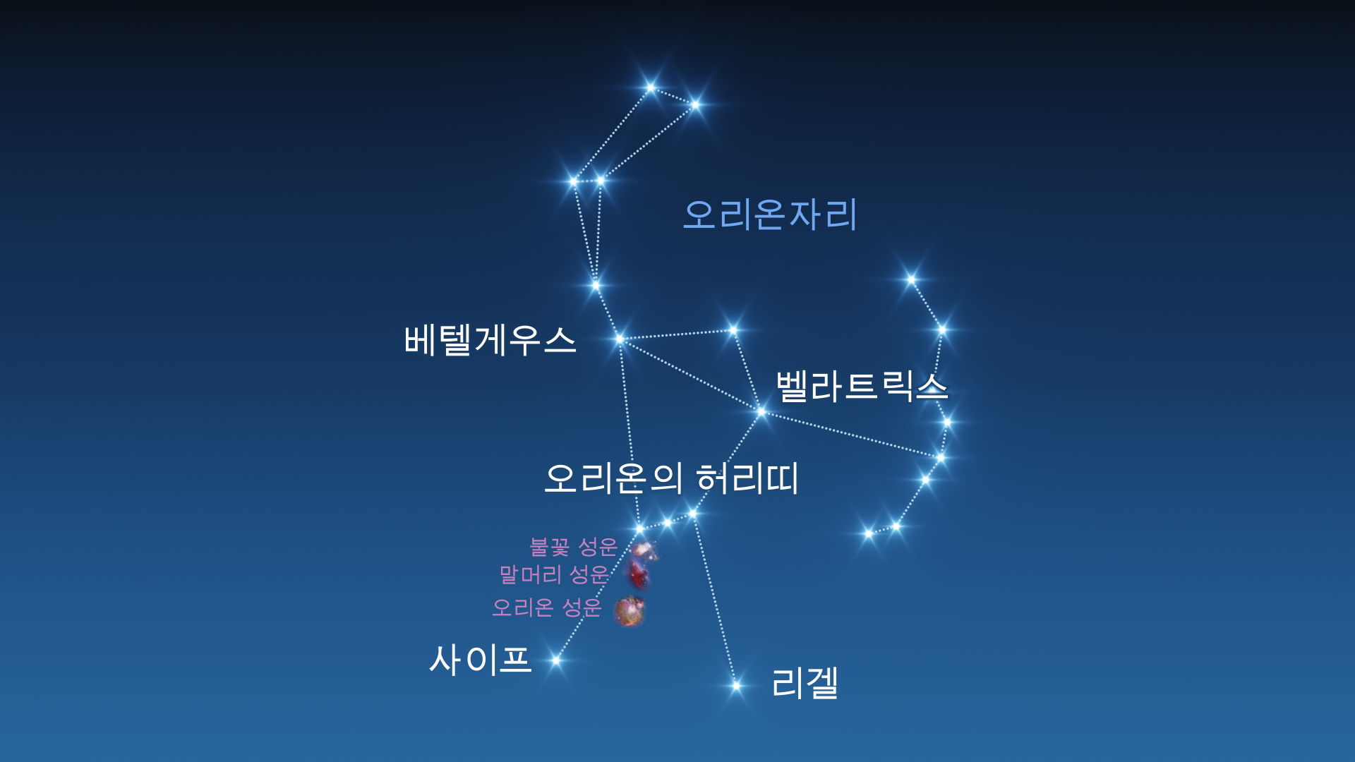오리온자리는 지구의 모든 곳에서 볼 수 있으며 가장 잘 알려진 별자리 중 하나입니다. 오리온자리의 유명한 성군(다른 밝은 별들을 찾는 데 종종 사용됨)가 있습니다. 오리온자리는 밤하늘에서 가장 밝은 10개의 별들 중 2개와 아마추어와 노련한 천문학자들에게 좋은 깊은 하늘의 목표물들을 가지고 있습니다. 또한, 일년 중 가장 많은 유성우 중 하나인 오리온자리 유성우와 관련이 있습니다.