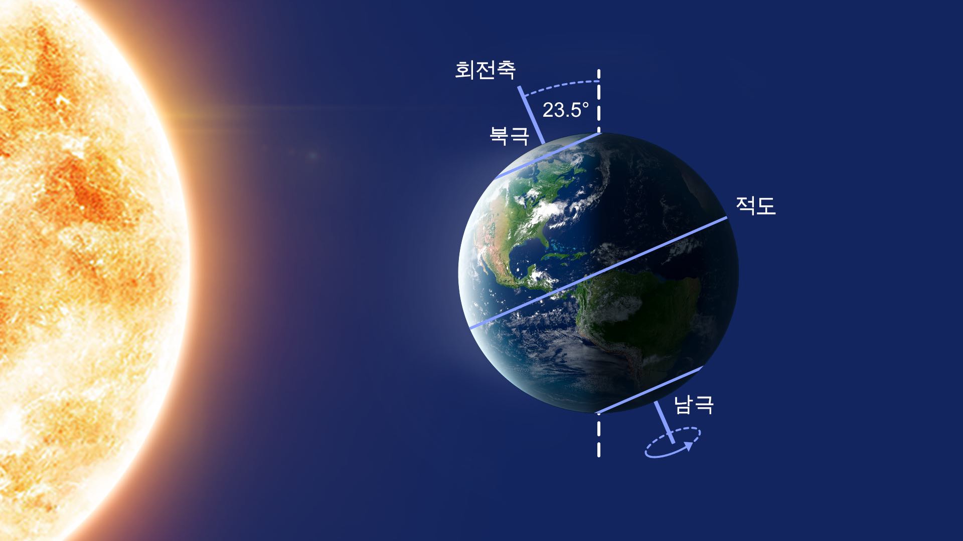 이 축은 지구 궤도면에 수직이 아니라 약 23.5° 기울어져 있습니다. 이 때문에 일 년 내내 북극과 남극이 태양을 향해 다른 각도로 기울어집니다(이 움직임을 시각화하는 데 어려움이 있다면 이 동영상 보기를 참조하세요).