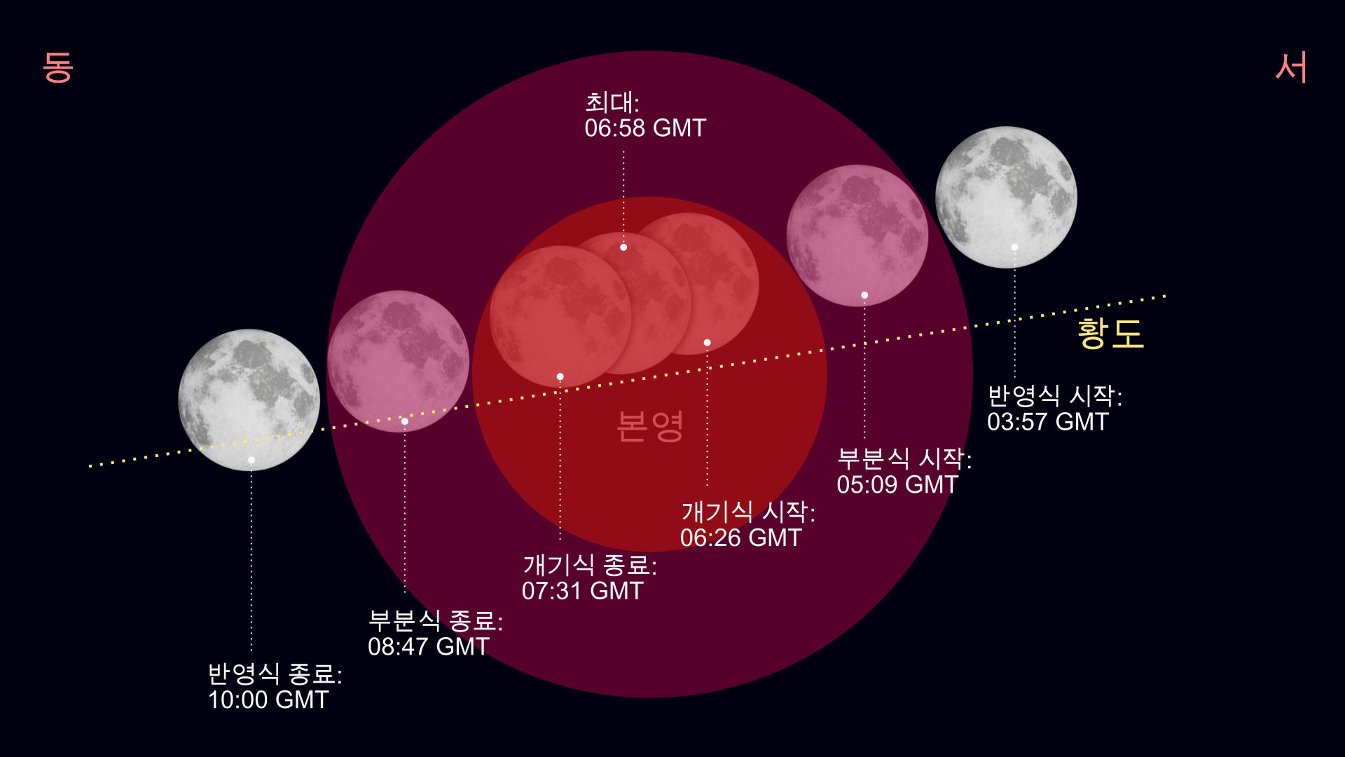 - 최대 월식은 06:58 GMT에 시작합니다.