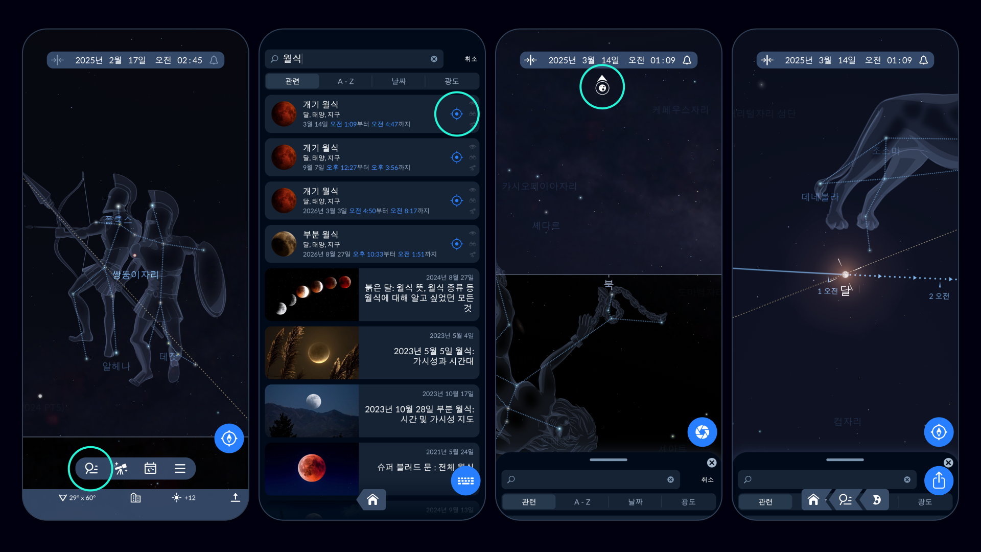 월식된 달이 하늘 지도에서 어디에 있을지 보려면 타겟 버튼을 탭하세요. 휴대폰의 이미지를 실제 하늘과 맞추려면 나침반 버튼을 탭한 다음 달이 화면에 나타날 때까지 흰색 화살표를 따라가세요. 달의 위치를 기록하고 미리 밤을 볼 계획을 세우세요!