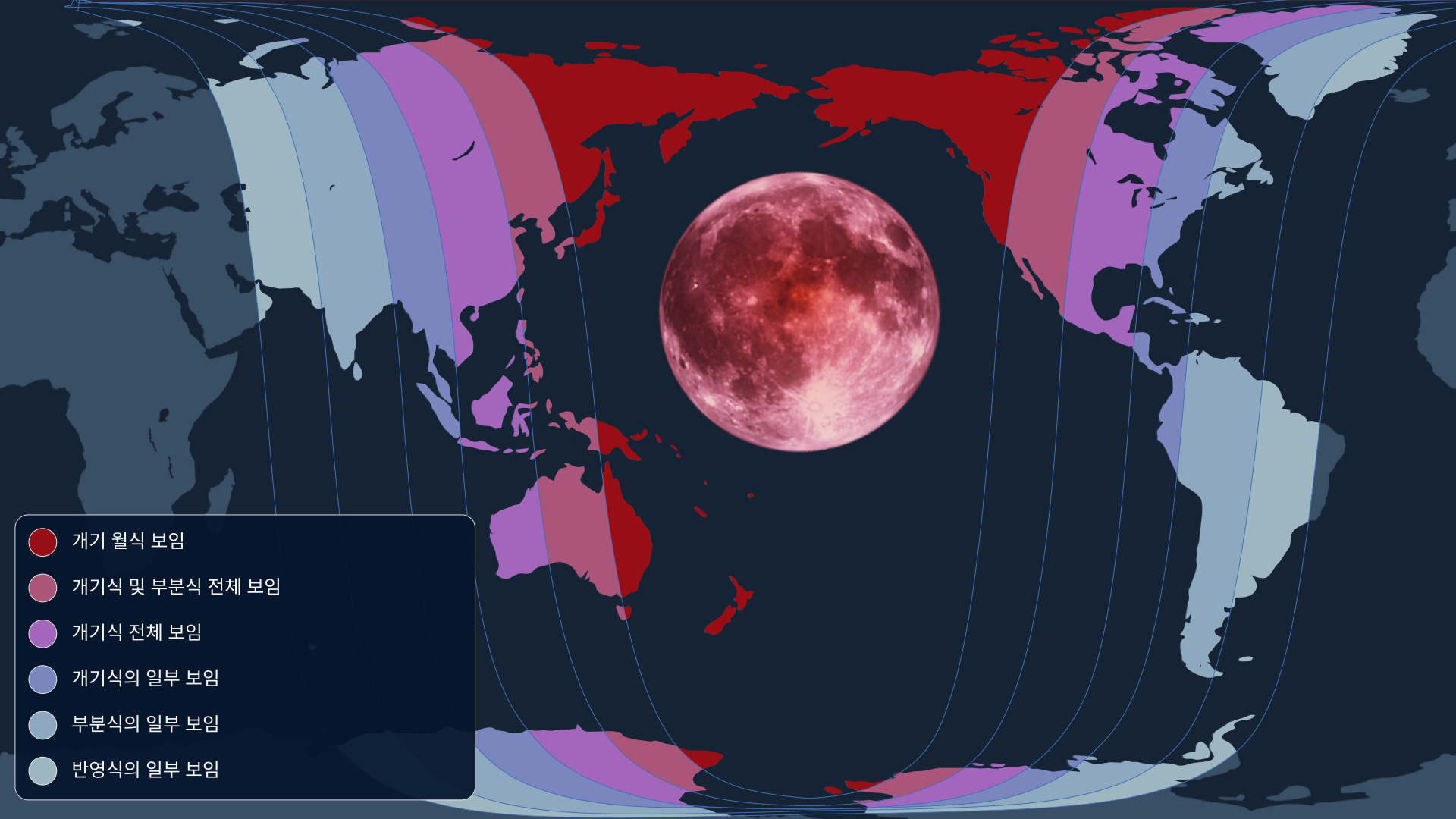 - 동아시아와 호주 서부/중부 일부 지역에서는 월식이 달이 뜨기 전에 시작됩니다. 이 지역에서는 달이 부분적으로 가려진 채 떠오르는 모습을 볼 수 있어, 반그림자 단계의 시작은 놓치더라도 개기월식 동안 붉은 달을 관측할 수 있습니다.