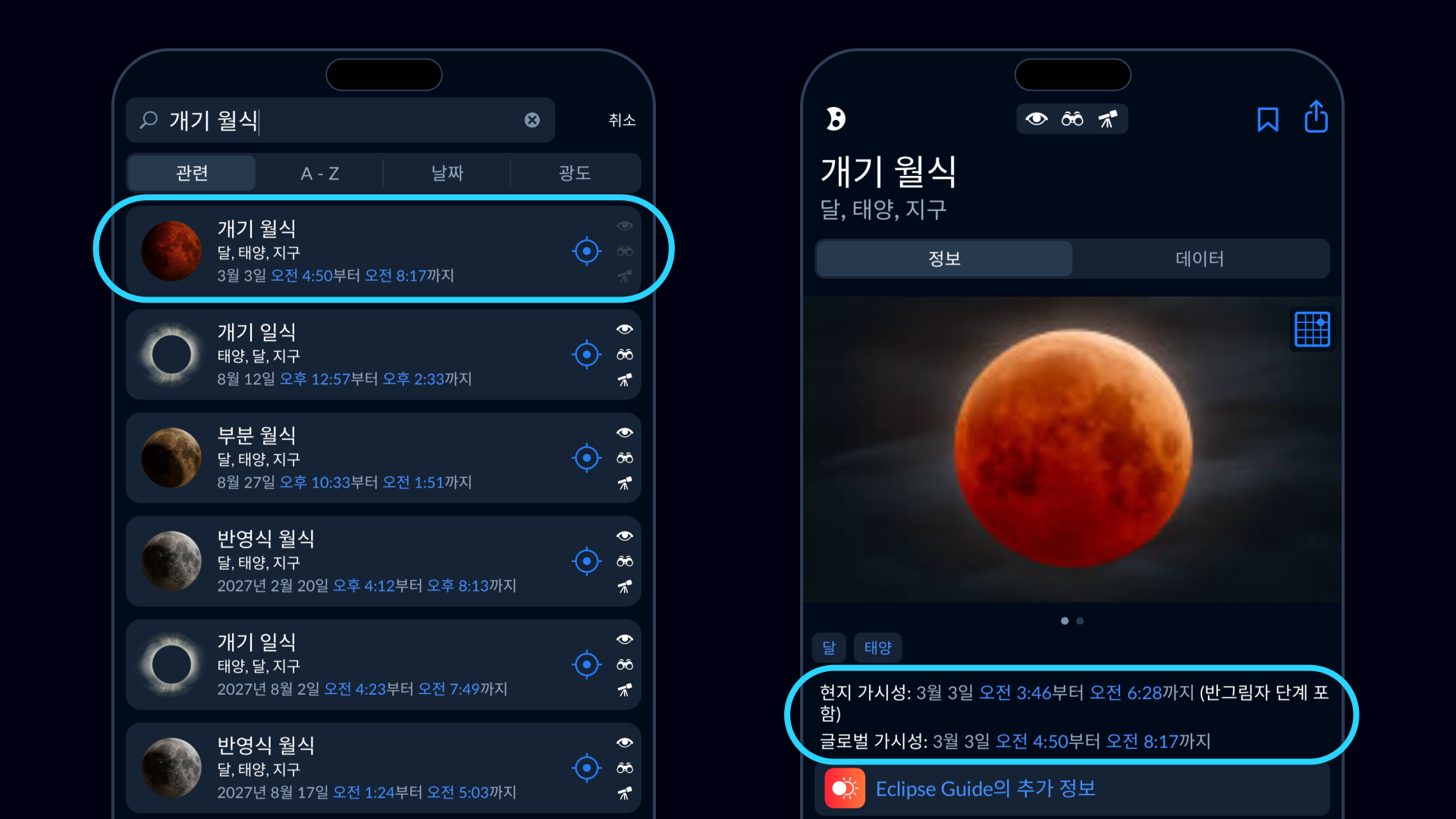 2026년 3월 블러드문의 정확한 현지 시간을 확인하려면 월식 및 월식 추적 전용 앱인 Eclipse Guide를 사용하세요.