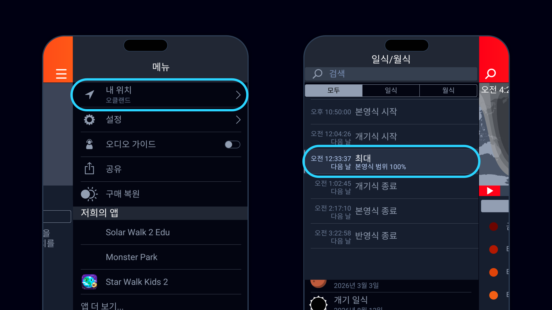- 앱을 열고 오른쪽 상단의 메뉴 아이콘을 탭하여 위치를 선택하세요. 위치를 선택하면 Eclipse Guide가 사용자 위치에 맞춰 모든 주요 월식 단계(반그림자 단계부터 개기월식, 최대 월식 순간까지)의 정확한 시간과 지속 시간을 자동으로 계산해 줍니다.