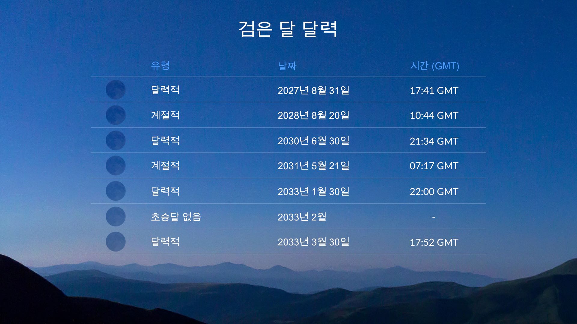 - 달력적 블랙문: 2027년 8월 31일 17:41 GMT / 2027년 9월 1일 02:41 KST