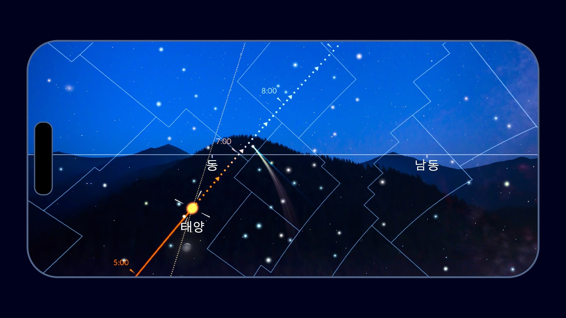 - 태양의 식별 가능한 통과 섹션에서 선택한 날짜의 파란색 일출/일몰 시간을 탭하면 앱이 하늘 지도에서 태양의 위치를 표시합니다.