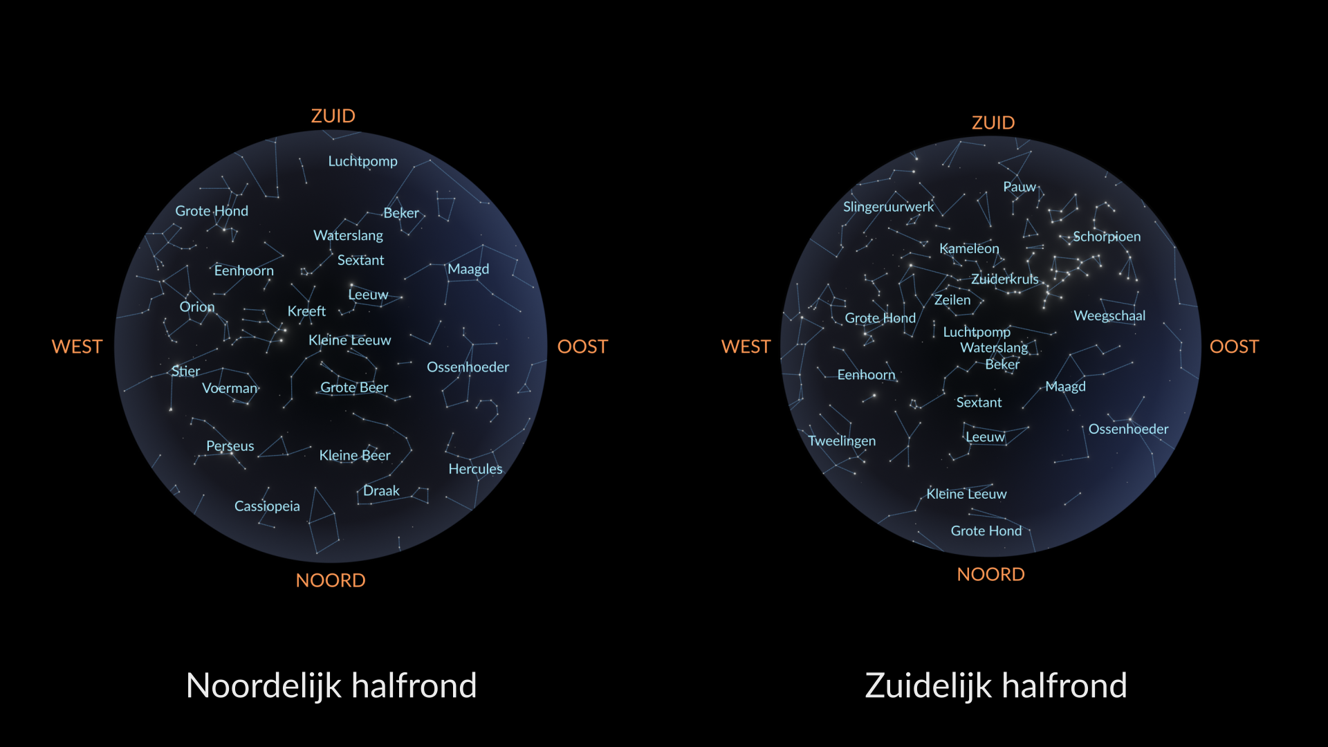 Sommige sterrenbeelden komen op en verdwijnen weer onder de horizon, maar andere gaan nooit onder. Die heten circumpolair — op het noordelijk halfrond zie je ze in het noorden. De circumpolaire sterrenbeelden van het zuidelijk halfrond bevinden zich in het zuiden.