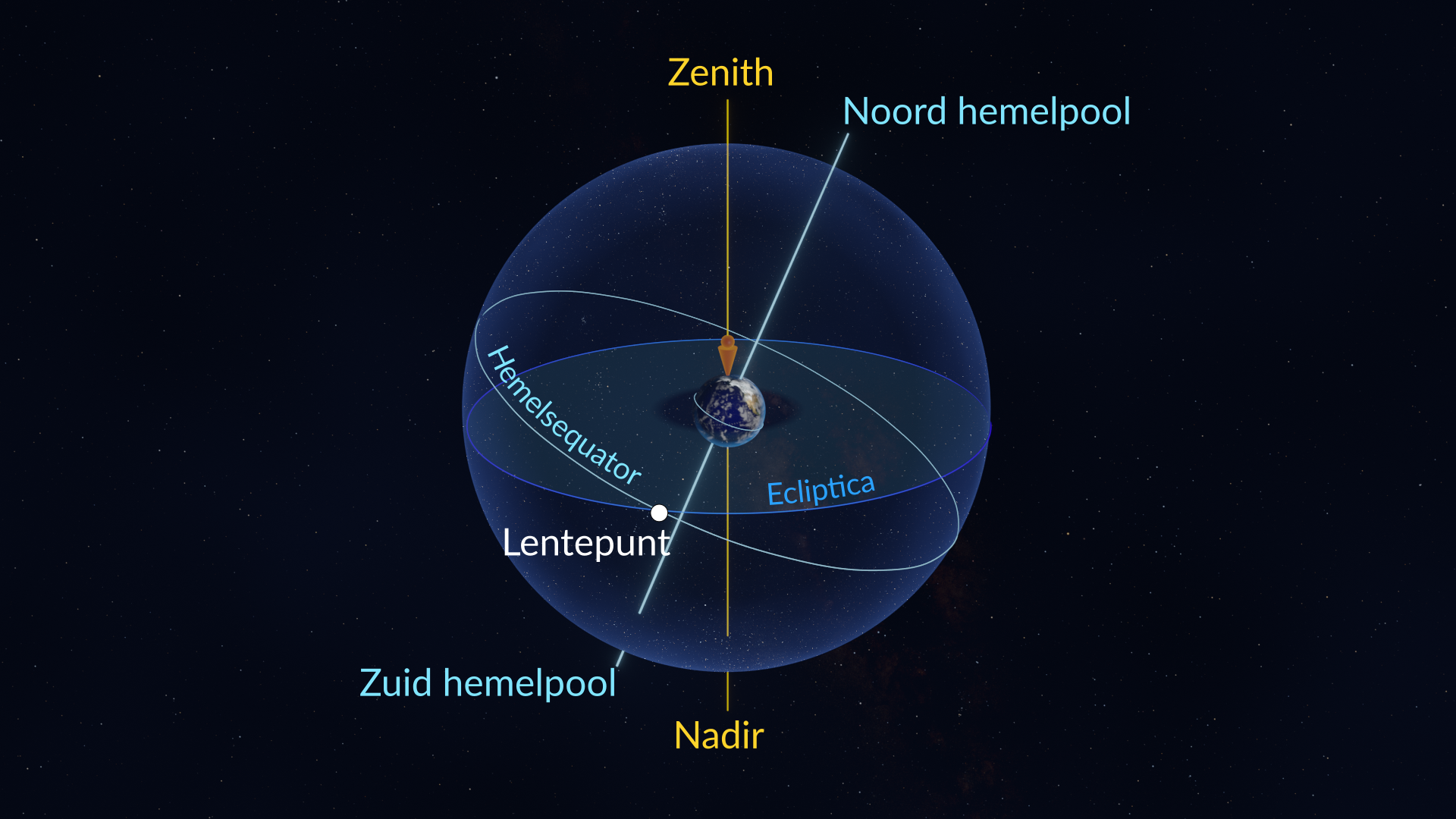 Hier zijn enkele belangrijke referentiepunten en lijnen op de hemelsfeer.