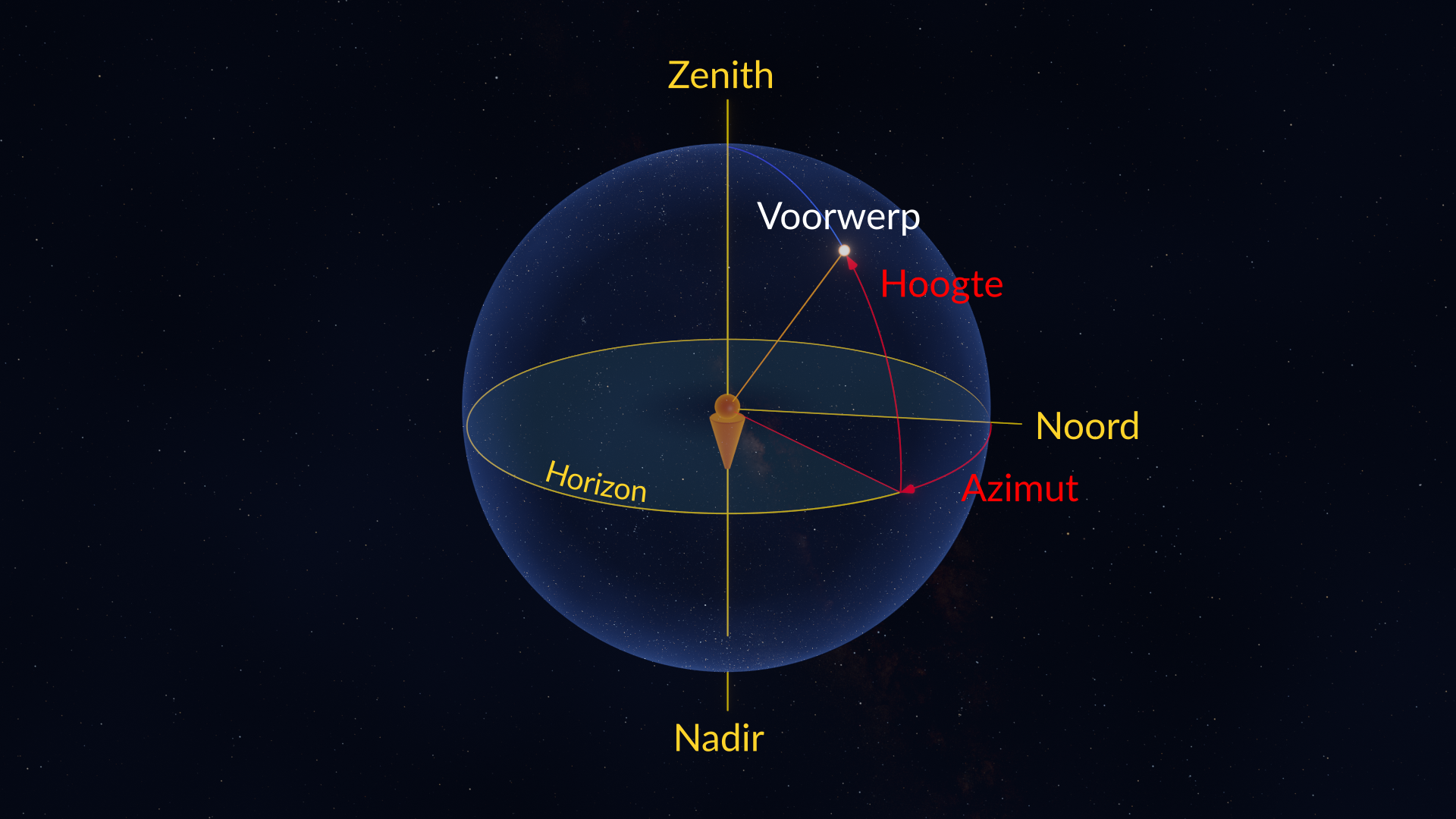 Hoogte vertegenwoordigt de hoekafstand van een object boven de horizon van de waarnemer. Het wordt gemeten in graden en varieert van +90° op het zenit tot -90° op het nadir. Als bijvoorbeeld een hemelobject op een hoogte van 45° staat, zou het halverwege de horizon en het zenit zijn.