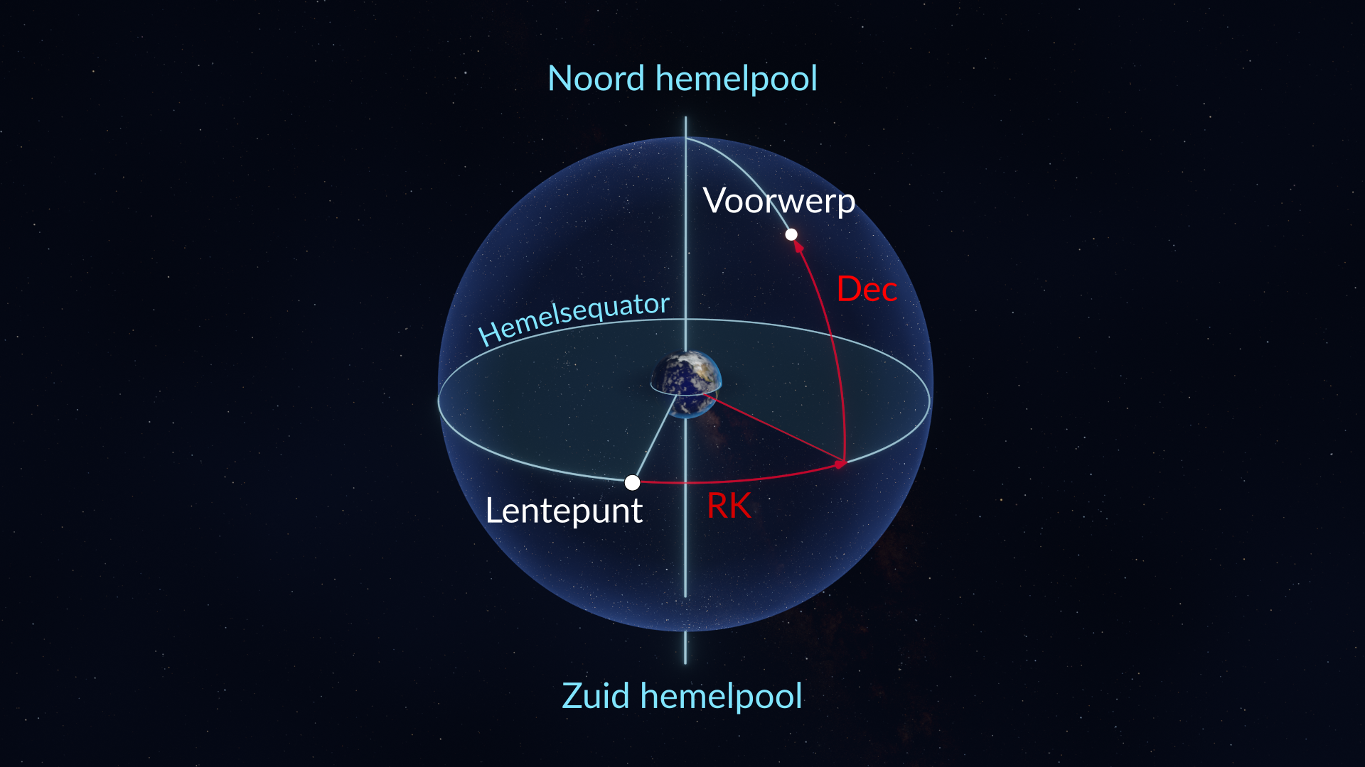 Declinatie (Dec) meet de hoekafstand van een object ten noorden of zuiden van de hemelsequator. Het is het hemelse equivalent van aardse breedtegraad. Declinatie wordt uitgedrukt in graden, variërend van +90° (Noordelijk Hemelpool) tot -90° (Zuidelijk Hemelpool). Als een object bijvoorbeeld een declinatie van +30° heeft, betekent dit dat het zich op een derde van de weg ten noorden van de hemelsequator bevindt.