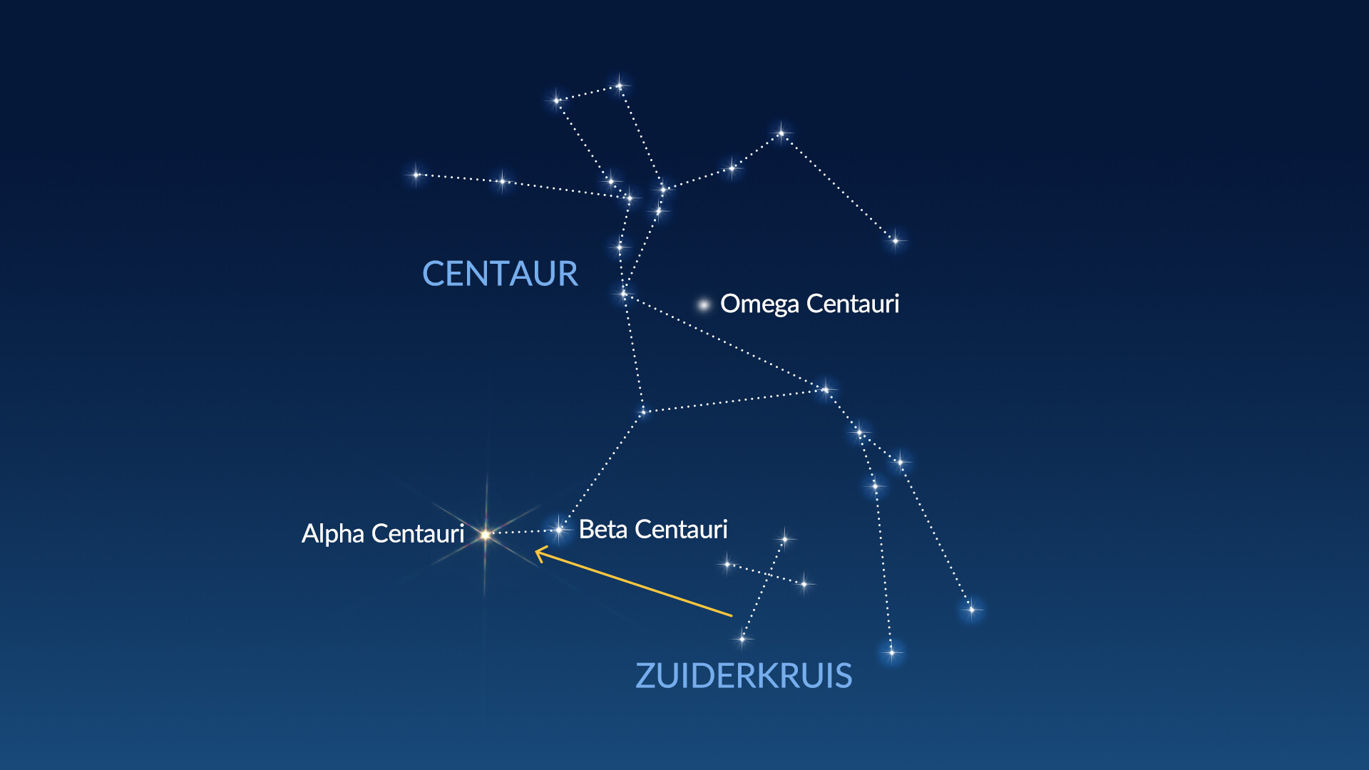 Vanaf hier wordt het iets lastiger, maar onder een donkere hemel kun je het lichaam van de Centaur herkennen als een driehoek van sterren boven het Zuiderkruis en de twee “aanwijzersterren” (Alpha en Beta Centauri). Als je twijfelt of je de juiste driehoek te pakken hebt, is er een heel duidelijke hint: op de rug van de Centaur zit een opvallende “ster” die eigenlijk een sterrenhoop is — Omega Centauri.