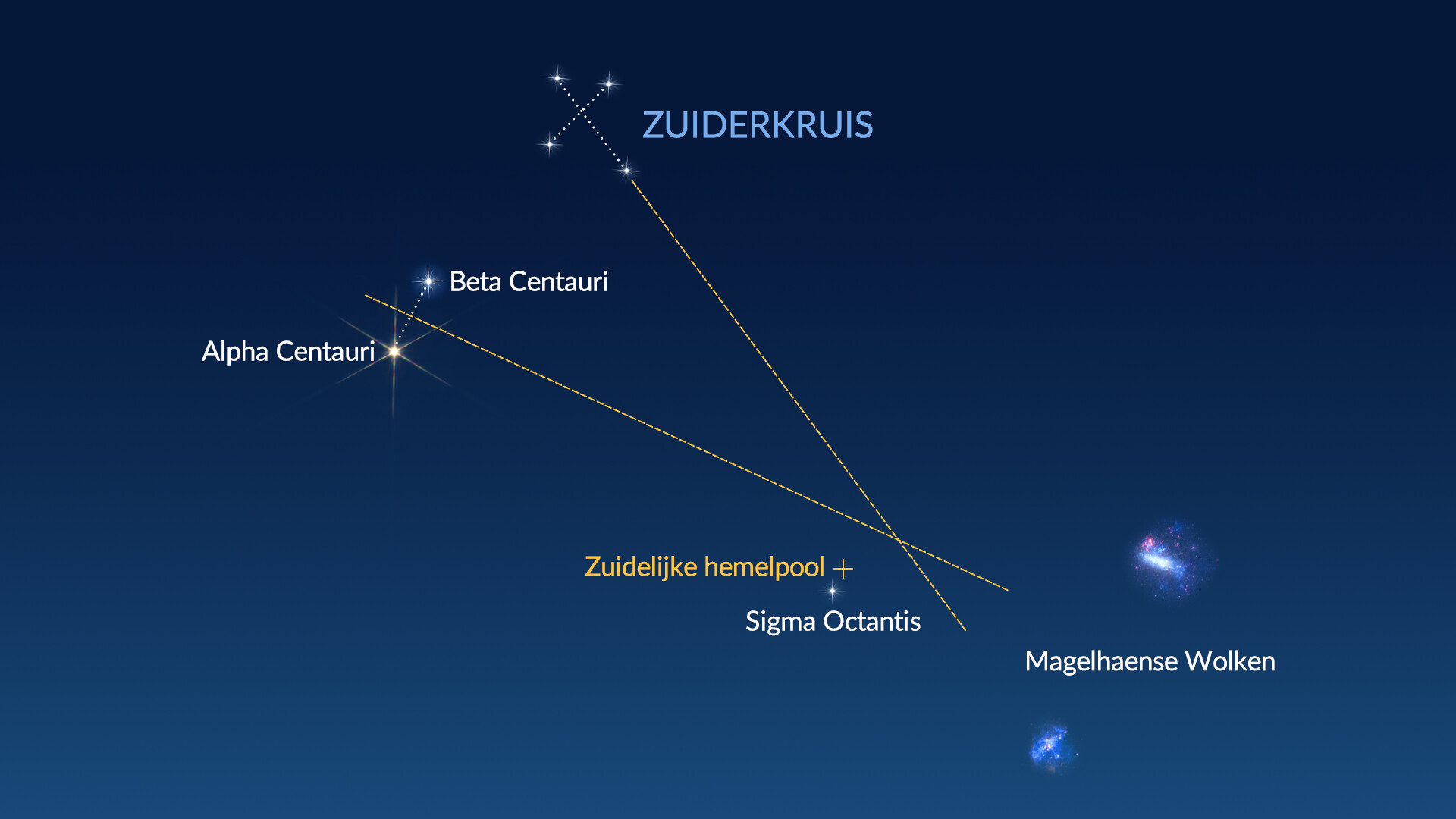 Een ingebouwd hemels kompas. De twee heldere sterren Alpha en Beta Centauri, ook wel de Southern Pointers genoemd, kunnen samen met het Zuiderkruis helpen om de richting van de zuidelijke hemelpool te bepalen.