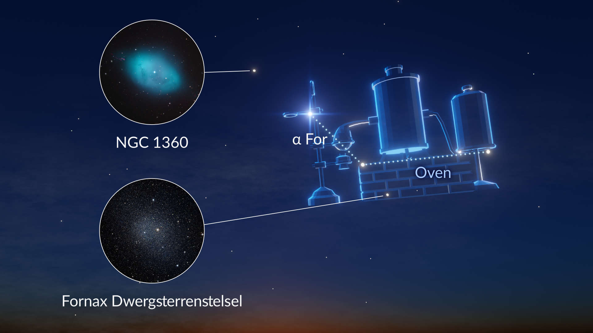 Als je je op noordelijke breedten bevindt, waar Achernar niet zichtbaar is, kijk je gewoon richting de zuidelijke horizon — in dat deel van de hemel staat Fornax er laag boven. Vanaf het zuidelijk halfrond staat Fornax veel hoger en is het bijna in het zenit te zien.