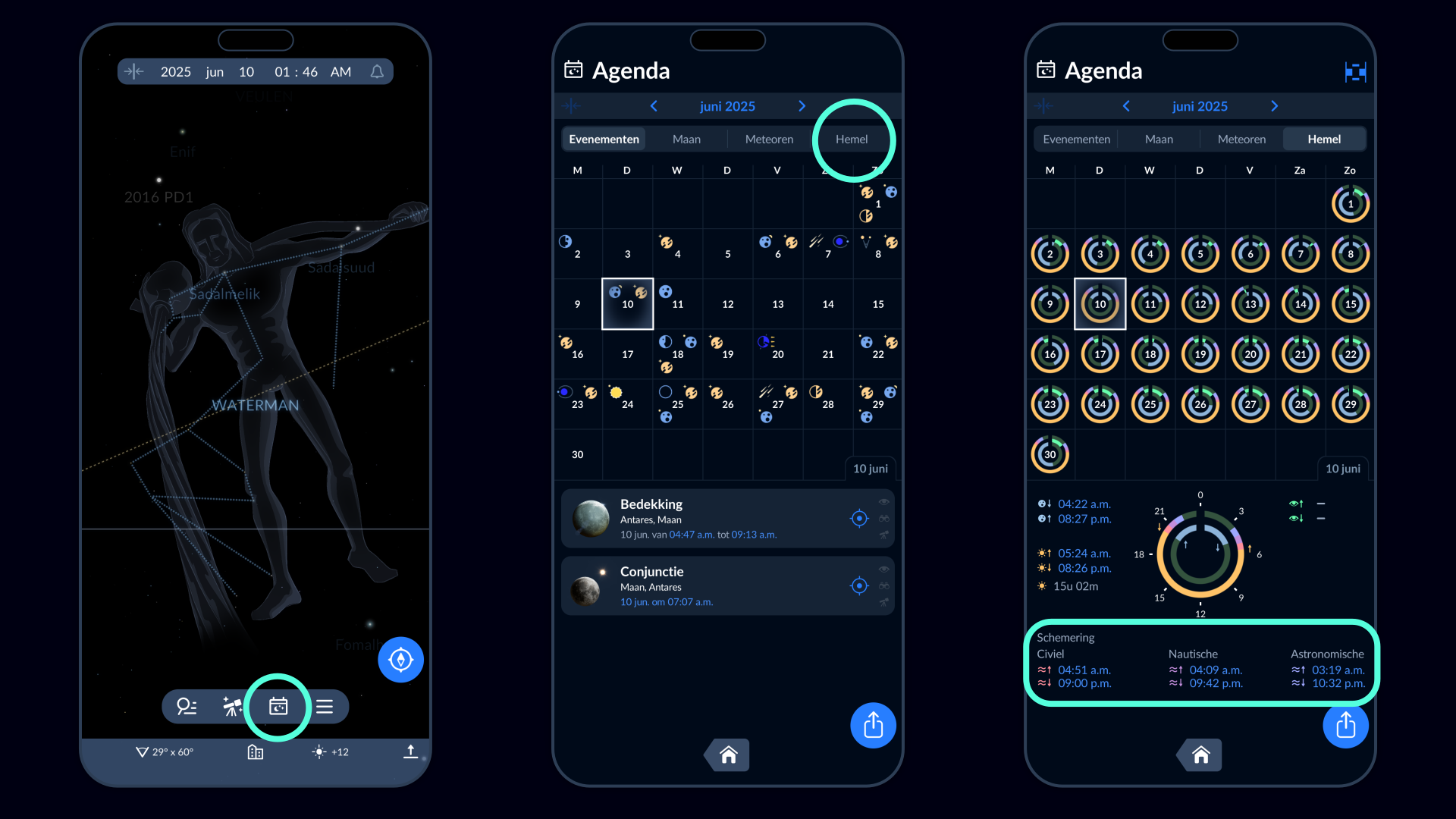 Wil je weten wanneer het op jouw locatie volledig duister is, gebruik dan de Sky Tonight-app. Open de app, tik op het kalenderpictogram onderaan het scherm en kies het tabblad 'Hemel'. Sky Tonight laat je zien wat de begin- en eindtijden van de volledige duisternis zijn en hoe lang deze periode duurt.