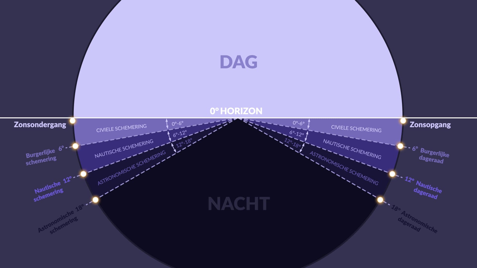 Ochtend- en avondschemering zijn specifieke tijdstippen, die afhangen van de positie van de zon in relatie tot de horizon. Samen met de schemering zijn er drie soorten zonsondergang en -opkomst. Hier zie je hoe laag onder de horizon het midden van de zon tijdens elke fase staat: