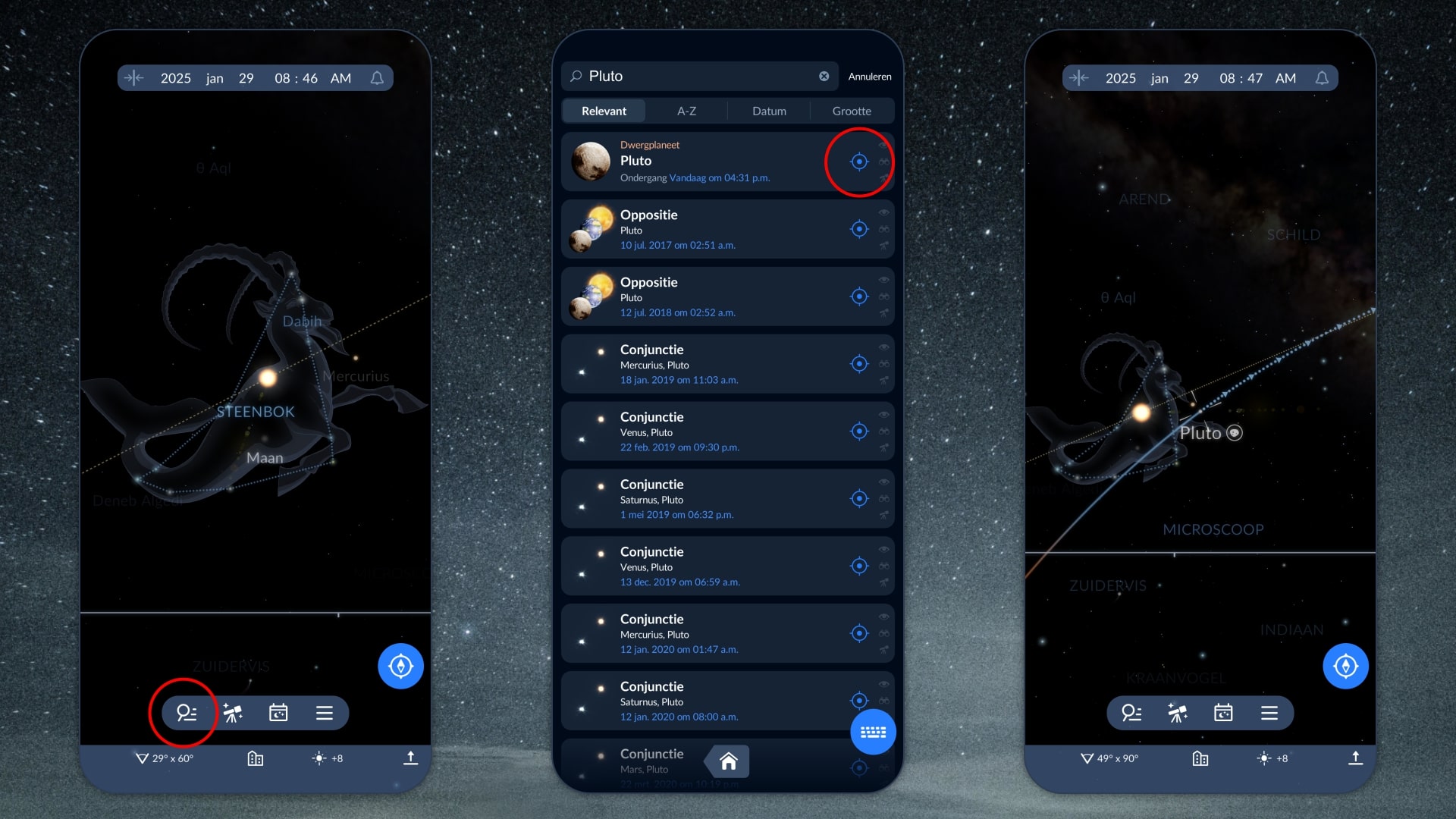 Pluto is niet makkelijk waar te nemen: zelfs door een telescoop ziet hij eruit als een heel zwak, sterachtig puntje dat moeilijk te onderscheiden is van de achtergrondsterren. Met de astronomie-app Sky Tonight kun je je echter in de nachtelijke hemel oriënteren en lastige objecten zoals Pluto opsporen. Tik op het vergrootglas-icoon onderaan het hoofdscherm, voer de naam van de dwergplaneet in het zoekveld in en tik op het blauwe doelwit-icoon tegenover het juiste resultaat. Snelle tip: Pluto is het best zichtbaar rond oppositie, wanneer hij het helderst is en het langst aan de nachtelijke hemel staat.