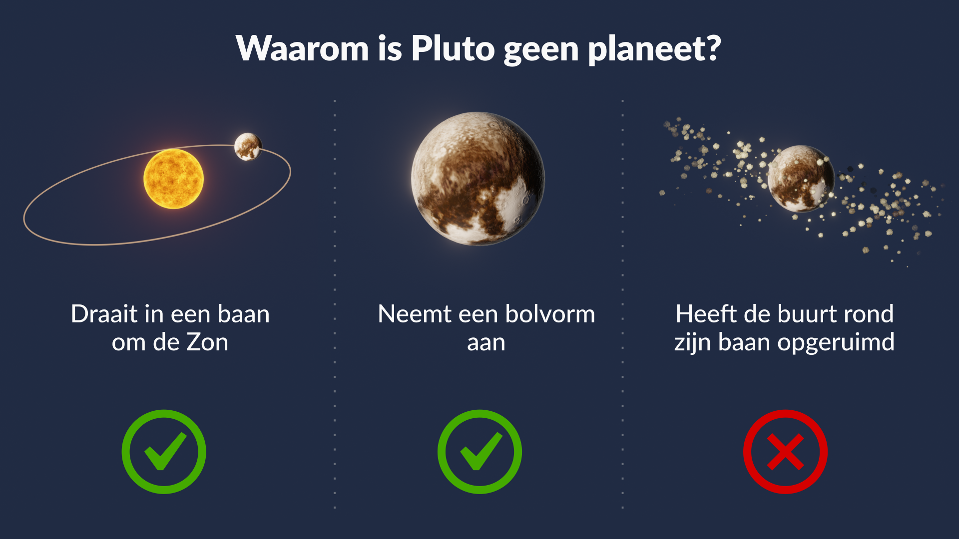 Hoewel Pluto om de zon draait en een ronde vorm heeft, is het niet het grootste object binnen zijn eigen baan. Dat komt doordat de baan van Pluto die van Neptunus doorkruist. Daarom wordt Pluto tegenwoordig als dwergplaneet geclassificeerd.