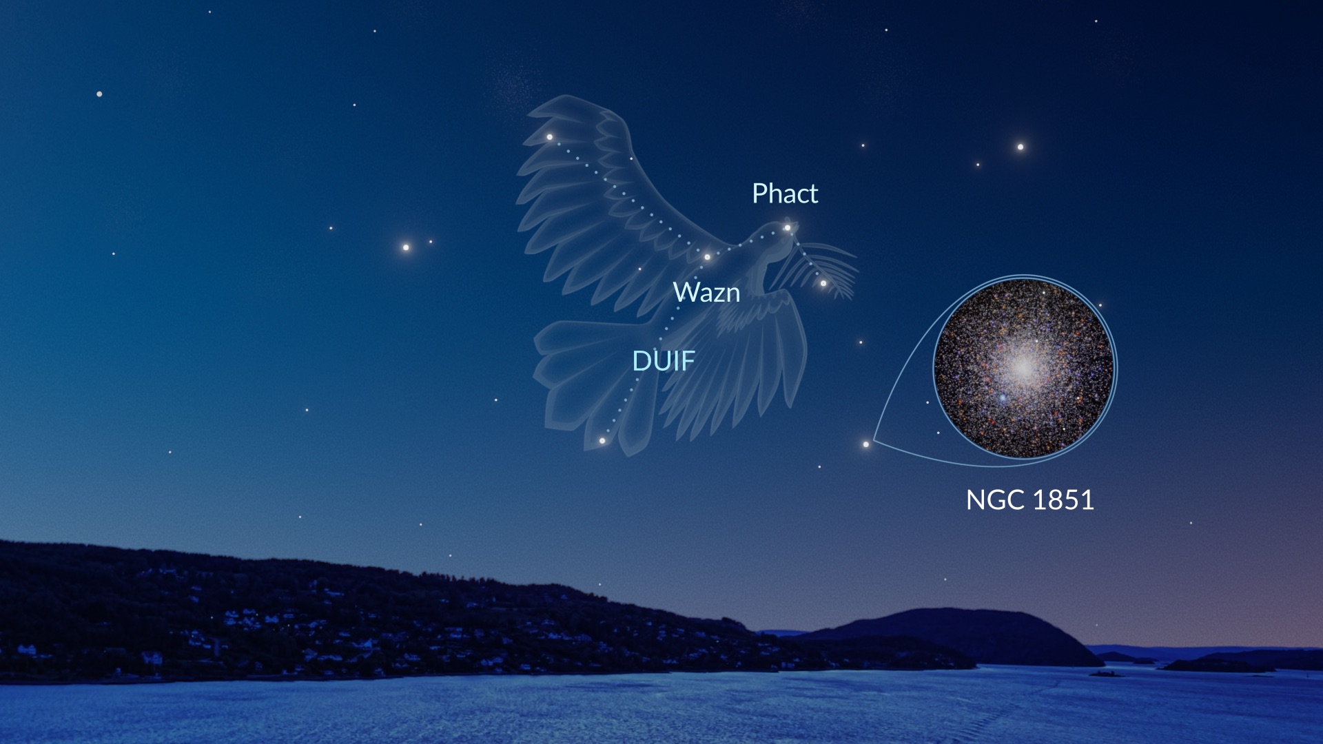 - Opvallend deep-sky-object: bolvormige sterrenhoop NGC 1851 (mag 7.3)