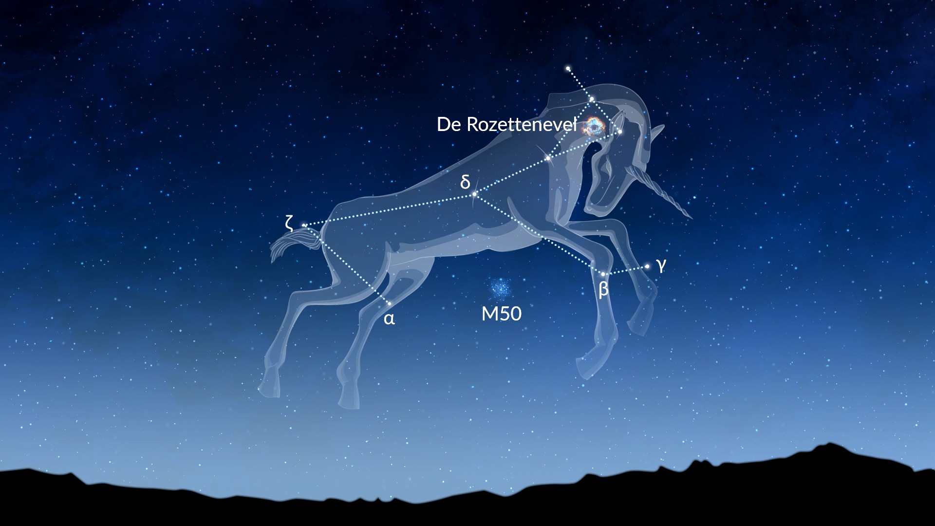 - Opvallend deep-sky-object: hartvormige sterrenhoop (M50, mag 5.9)