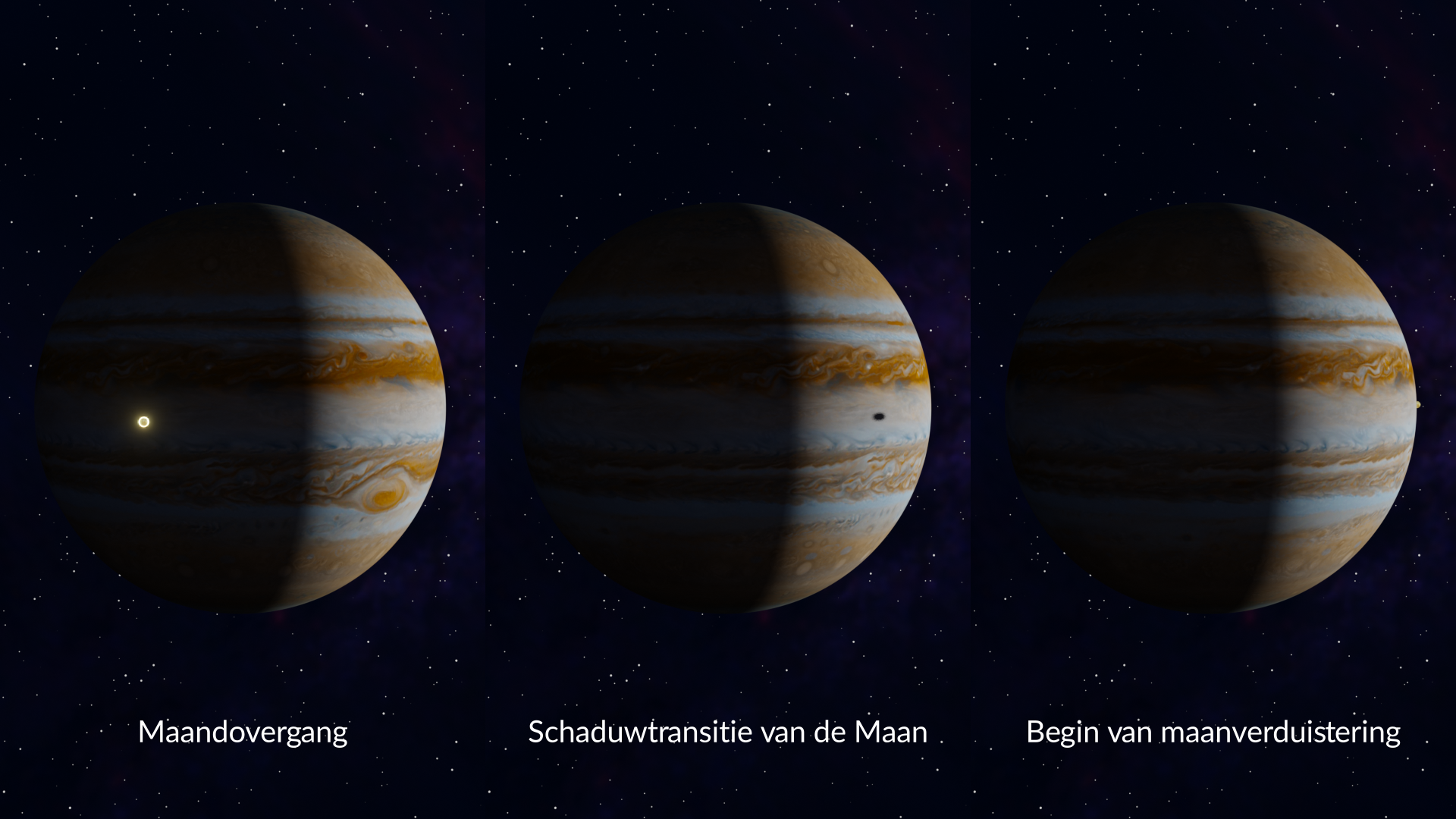 - Occultatie: een maan verdwijnt tijdelijk achter Jupiter.